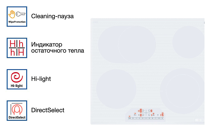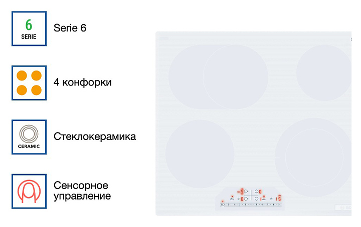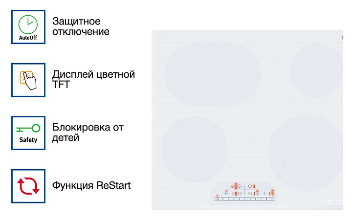Электрическая варочная панель Bosch PKN652FP2E серии 6 предназначена для приготовления большого ассортимента блюд в наплитной посуде в домашних условиях. Модель оснащена 4 конфорками различной мощности, сенсорной панелью управления DirectSelect, цветным TFT дисплеем, таймером, 2-контурной и овальной конфорками. Нагревательные элементы Hi-light при температуре выше 50 °С начинают светиться красным, что является элементом безопасности. Функция ReStart сохраняет все установленные настройки варочной панели при неожиданном отключении прибора из-за возникших проблем. Рабочая поверхность выполнена из стеклокерамики. Особенности: