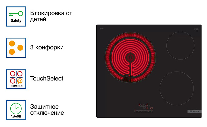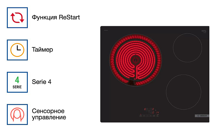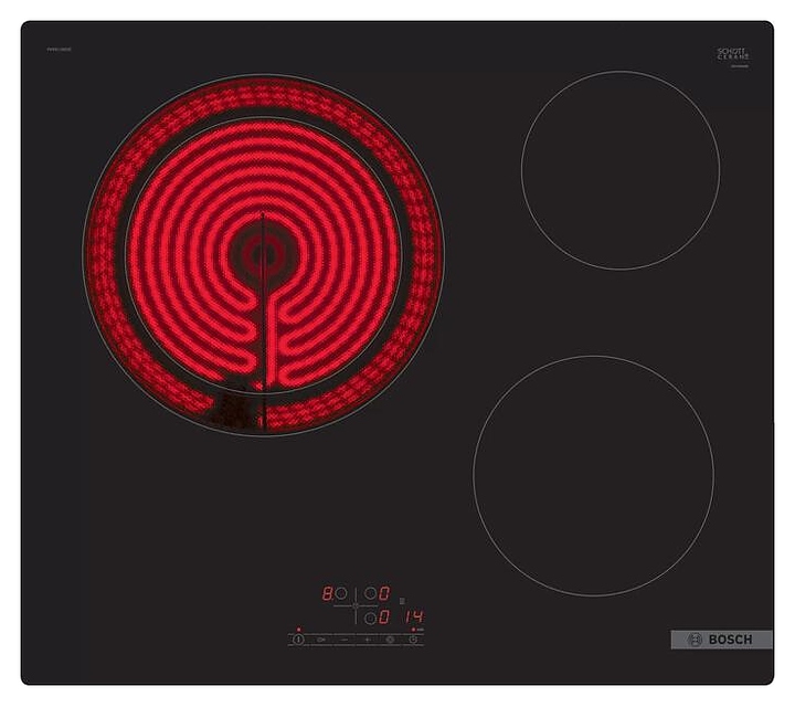 Электрическая варочная панель Bosch PKK611BB2E серии 4 предназначена для приготовления большого ассортимента блюд в наплитной посуде в домашних условиях. Модель оснащена 3 конфорками различной мощности, сенсорной системой управления TouchSelect и таймером. Нагревательные элементы Hi-light при температуре выше 50 °С начинают светиться красным, что является элементом безопасности. Функция ReStart сохраняет все установленные настройки варочной панели при неожиданном отключении прибора из-за возникших проблем. Рабочая поверхность выполнена из стеклокерамики. Особенности: