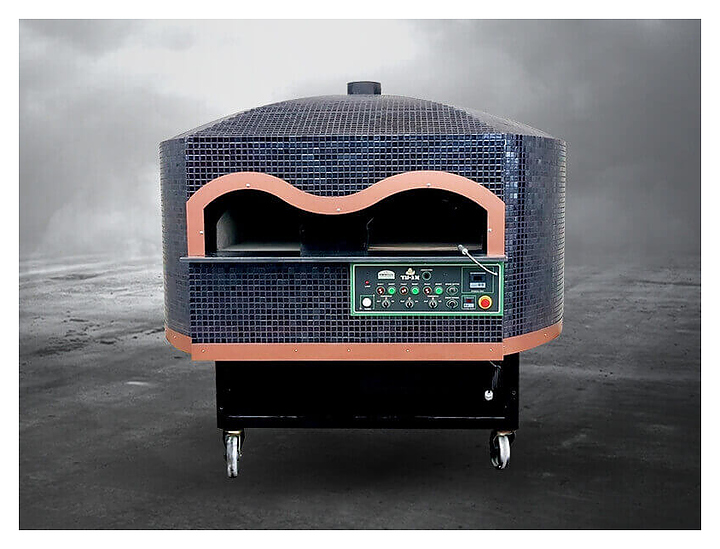 Комбинированная ротационная печь Firinmak RotAroWoodElectro 150 используется в ресторанах, барах, кафе, на других предприятиях общественного питания и торговли для выпекания пиццы, хлеба и пирогов, приготовления шашлыка и гриль-блюд, обжарки, тушения и запекания по рецептуре, основанной на томлении и длительной выдержке при медленно падающей температуре. Модель оснащена камерой с подом и куполом круглого сечения, отсеком для загрузки дров с круглой распашной дверью с прозрачным обзорным остеклением, устьем в форме арки с фиксированными боковыми и съемной центральной заслонками, отверстием дымохода сверху, расположенной под устьем электромеханической панелью управления с поворотными переключателями, функциональными клавишами, светодиодными индикаторами и цифровыми дисплеями. Купол выполнен из огнеупорных бетонных блоков, стенд – из металла с антикоррозийным покрытием, внешняя облицовка купола – из листовой стали с антикоррозийным покрытием порошковой краской, теплоизоляция свода купола – из минеральной ваты, теплоизоляция основания – из газобетона. Декоративная отделка не входит в комплект поставки и приобретается отдельно. Особенности: