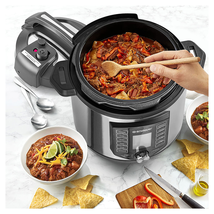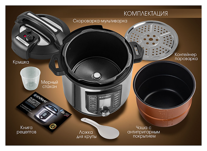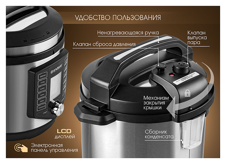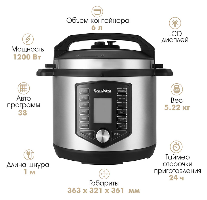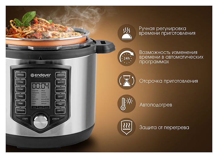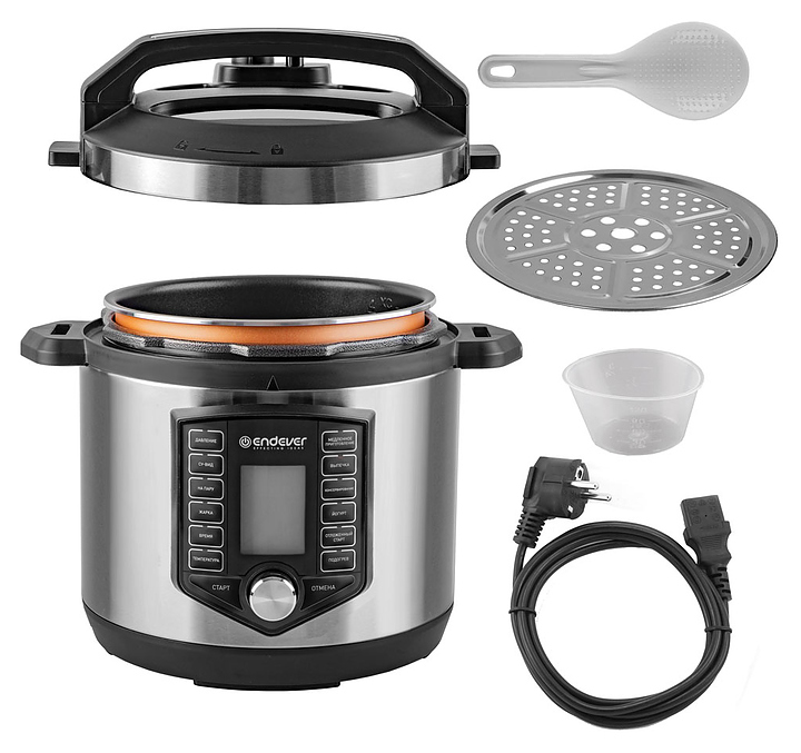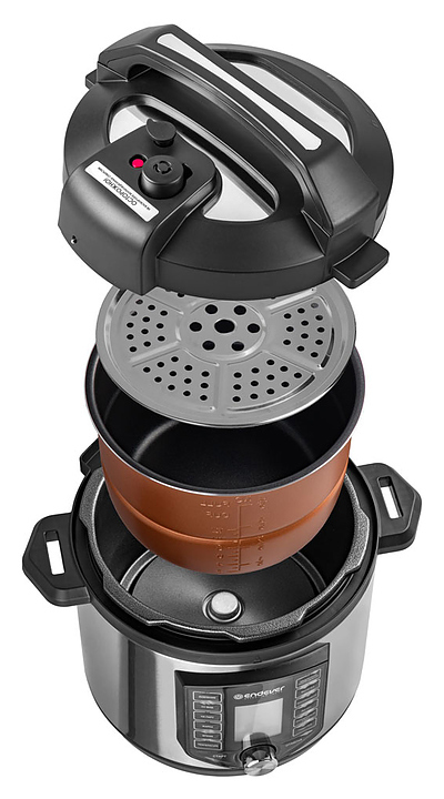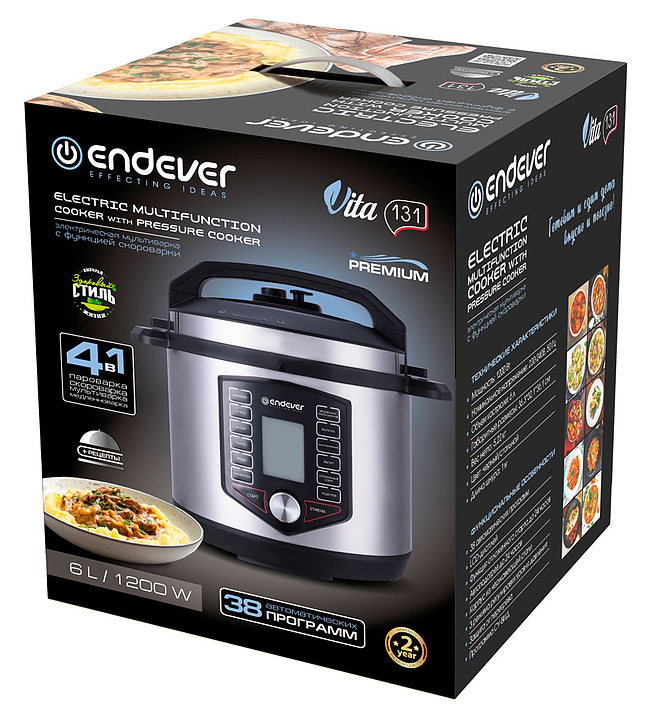 Мультиварка-скороварка ENDEVER VITA-131 предназначена для приготовления на пару, обжаривания, тушения, выпечки и варки различных продуктов в квартирах и частных домах. Модель оснащена электронной панелью управления, LСD-дисплеем, сборником конденсатора, клапанами выпуска пара и сброса давления. Ненагревающаяся ручка и защита от перегрева гарантируют комфортную эксплуатацию. Программа су-вид позволяет готовить блюда при низкой температуре. Корпус выполнен из нержавеющей стали. В комплект поставки входят съемная чаша, контейнер-пароварка, ложка, мерный стакан, книга рецептов и шнур питания. Особенности: