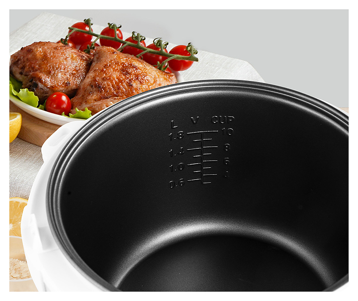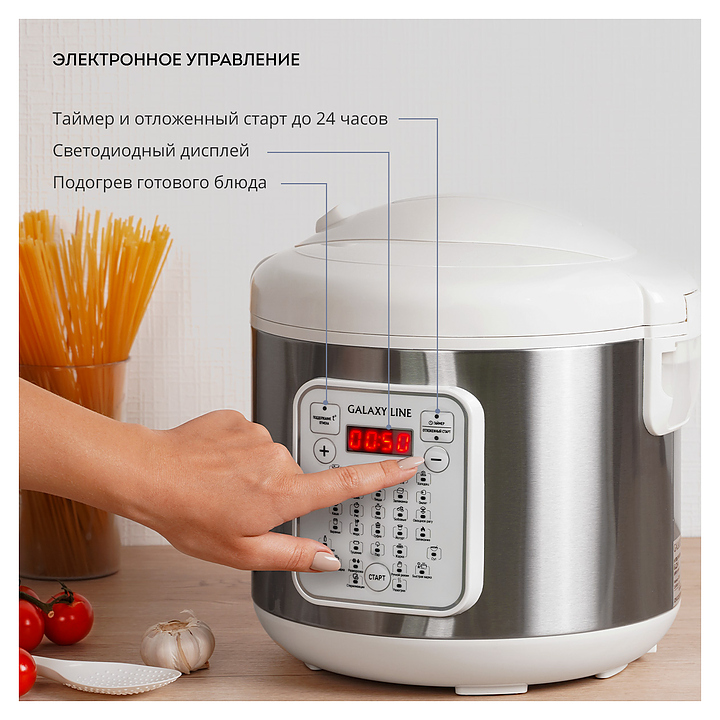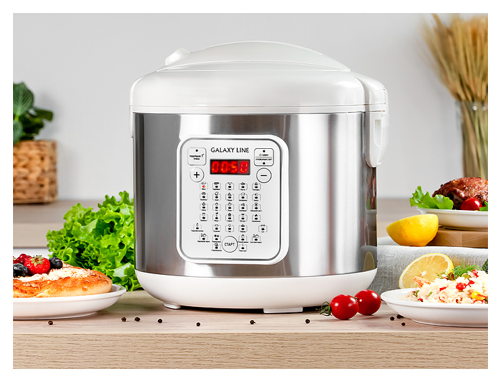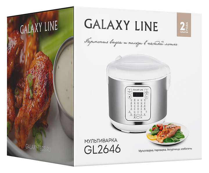 Мультиварка GALAXY LINE GL2646 предназначена для приготовления на пару, обжаривания, тушения, выпечки и варки различных продуктов в квартирах и частных домах. Модель оснащена электронным управлением, светодиодным дисплеем, таймером, выпускным клапаном и съемным контейнером для сбора конденсата. Антипригарное покрытие чаши позволяет готовить с использованием минимального количества масла и сохраняет естественный вкус. В комплект поставки входят съемный контейнер для сбора конденсата, съемная чаша, емкость для приготовления на пару, ложка, мерный стакан, половник и книга рецептов. Особенности: