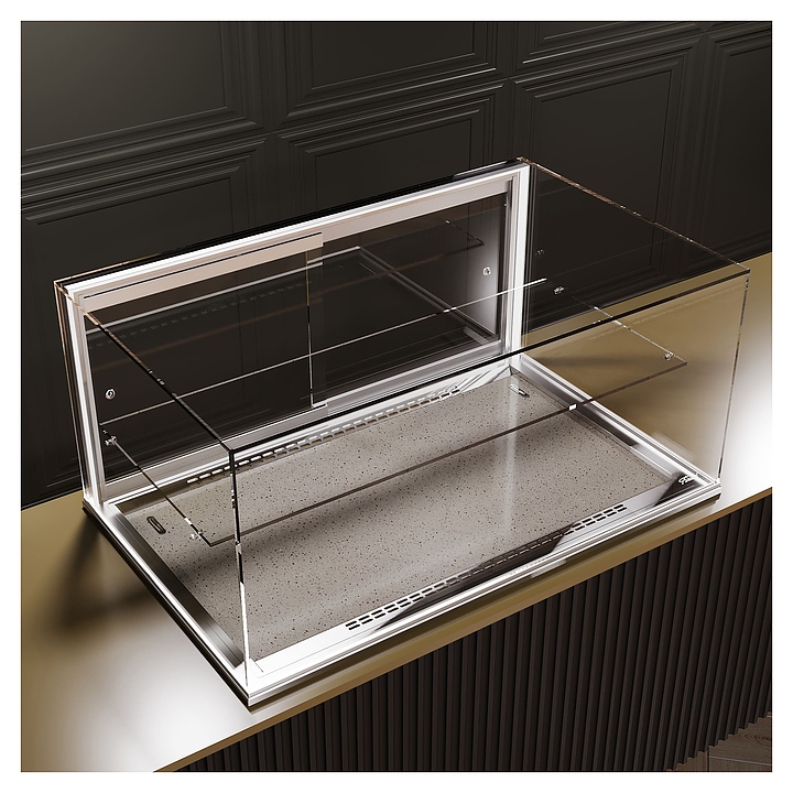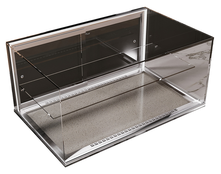 Встраиваемая горизонтальная кондитерская витрина Finist Glassier812 Stone Gst812-13/65/5 предназначена для кратковременного хранения и предпродажной демонстрации кондитерских изделий на предприятиях общественного питания и торговли. Модель оснащена закрытой холодильной камерой с навесной полкой, скрытыми под основанием камеры агрегатным отсеком, кабелем питания с вилкой и электромеханической панелью управления. Основание камеры выполнено из высококачественной нержавеющей стали с серебристой зеркальной поверхностью, столешница для выкладки – из искусственного камня, корпус агрегатного отсека – из стали с антикоррозийным покрытием белого цвета (RAL 9016). Особенности: