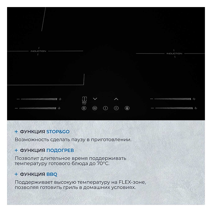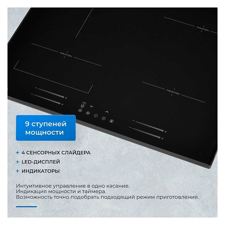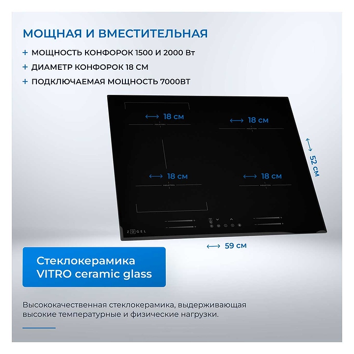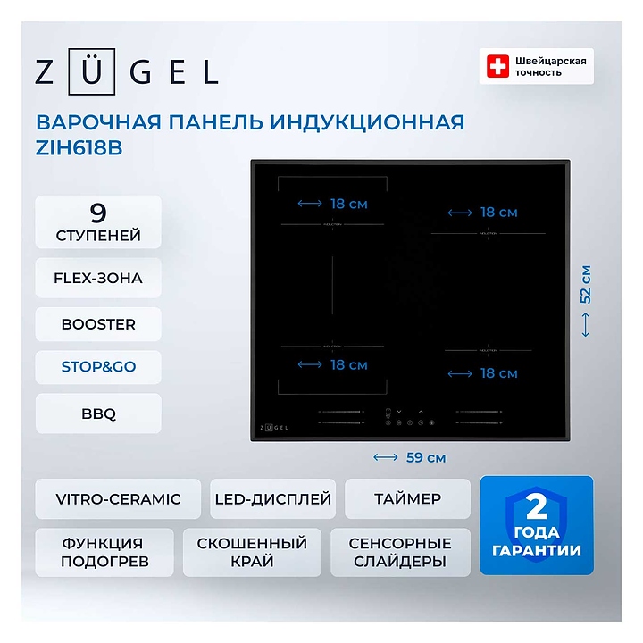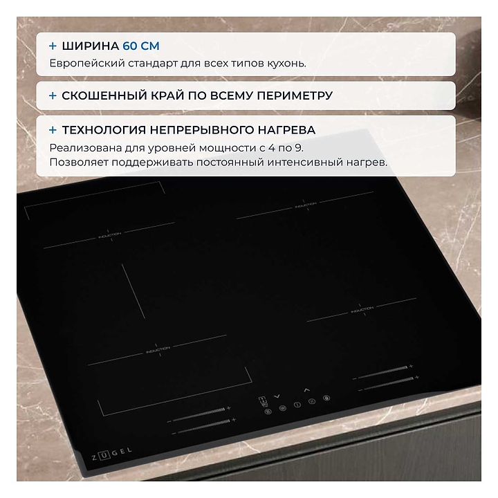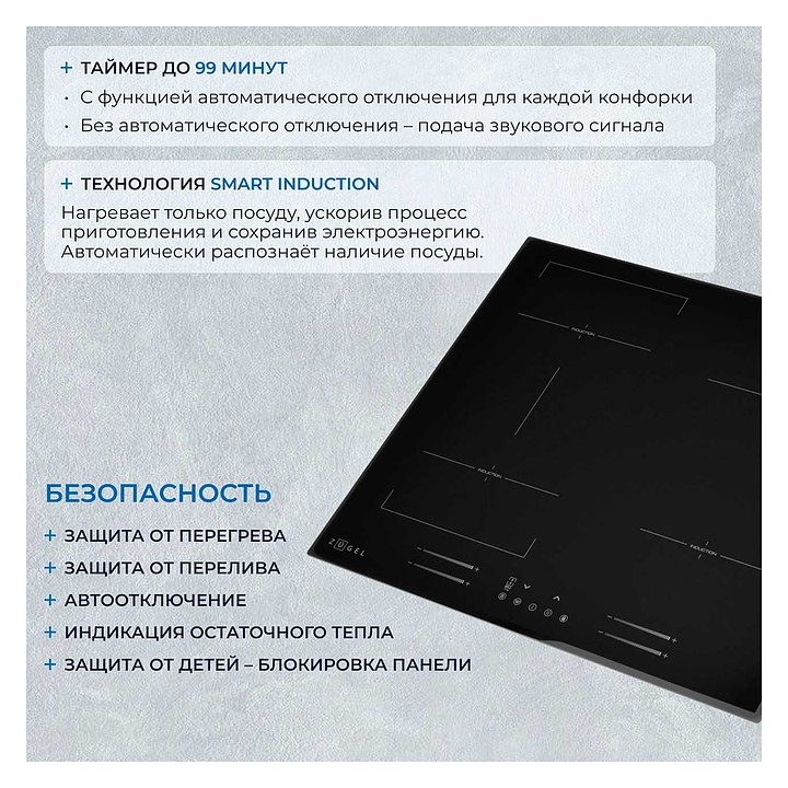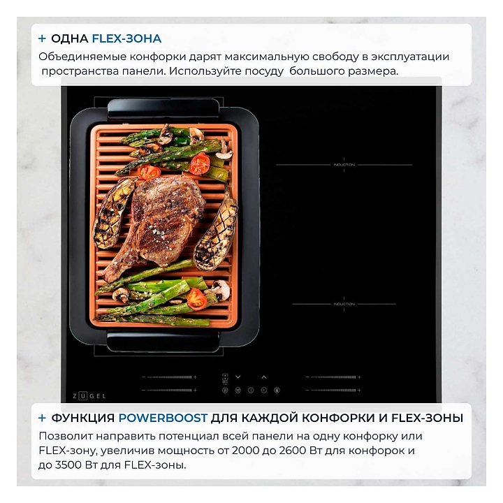 Варочная панель Zugel ZIH618B предназначена для приготовления большого ассортимента блюд в наплитной посуде в домашних условиях. Модель оснащена сенсорным слайдером для каждой конфорки, LED дисплеем, таймером, 1 FLEX-зоной для объединения конфорок и использования посуды большого размера. Индукционная технология Smart Induction обеспечивает передачу до 90% энергии непосредственно посуде, что значительно экономит электроэнергию по сравнению с традиционными плитами. Отсутствие открытого огня и минимальный нагрев окружающей среды делают приготовление пищи более безопасным и комфортным. Режим усиленного нагрева PowerBoost для повышения мощности на одну конфорку или FLEX-зону. Поверхность выполнена из высококачественной стеклокерамики Vitro Ceramic Glass, выдерживающей высокие температурные и физические нагрузки. Особенности: