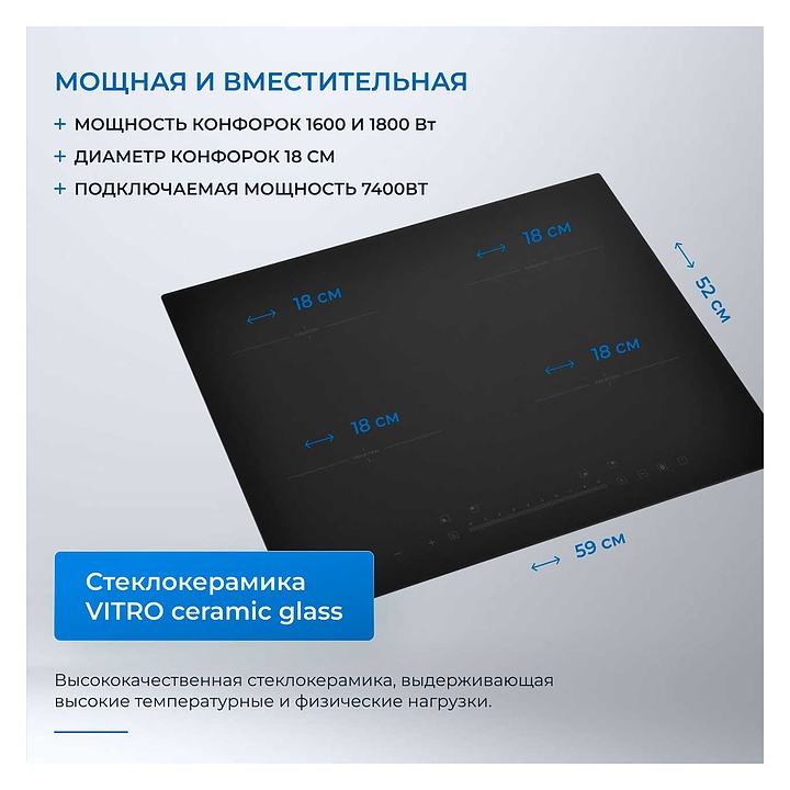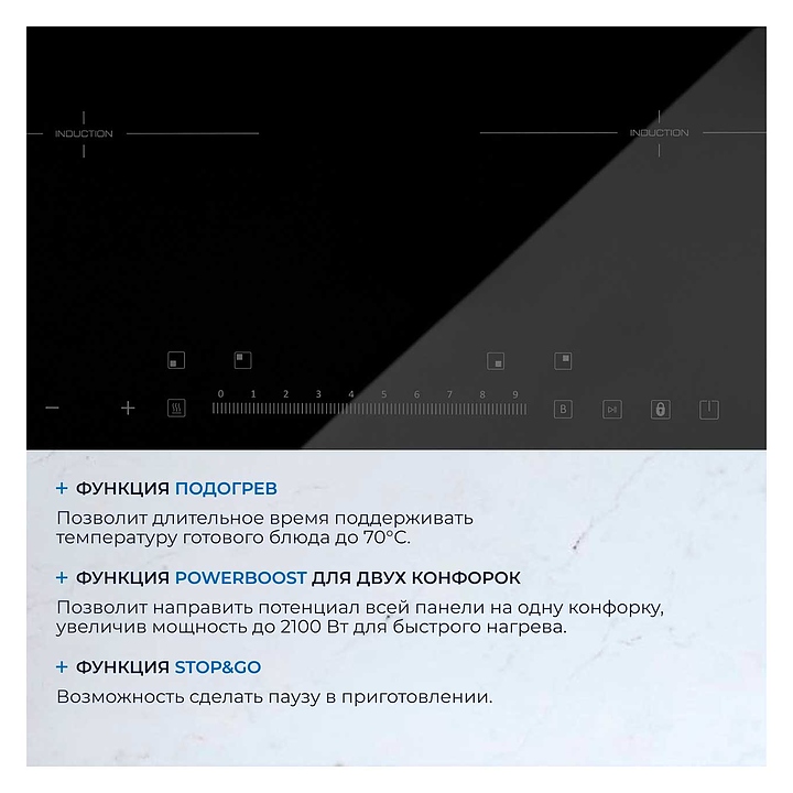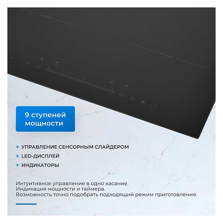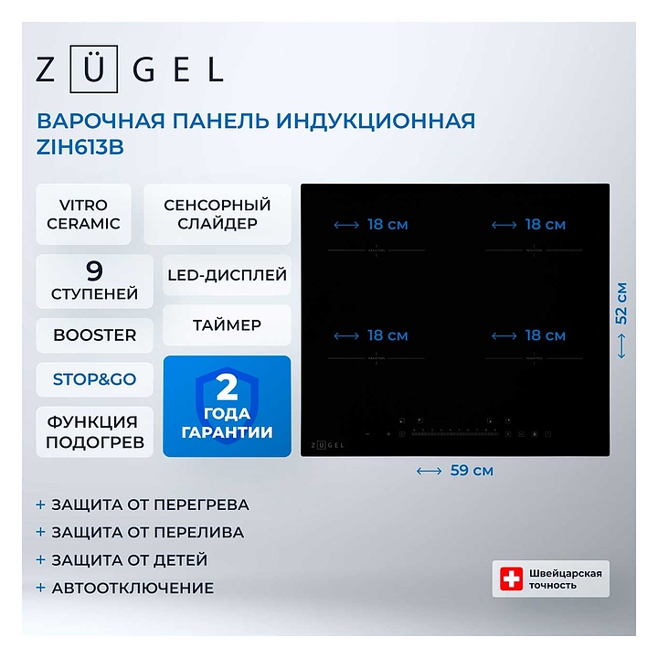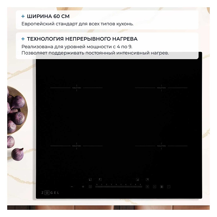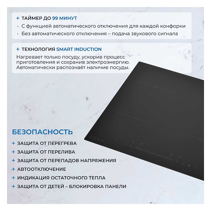 Варочная панель Zugel ZIH613B предназначена для приготовления большого ассортимента блюд в наплитной посуде в домашних условиях. Модель оснащена сенсорным слайдером, LED дисплеем и таймером. Индукционная технология Smart Induction обеспечивает передачу до 90% энергии непосредственно посуде, что значительно экономит электроэнергию по сравнению с традиционными плитами. Отсутствие открытого огня и минимальный нагрев окружающей среды делают приготовление пищи более безопасным и комфортным. Режим усиленного нагрева PowerBoost для повышения мощности на одну конфорку. Поверхность выполнена из высококачественной стеклокерамики Vitro Ceramic Glass, выдерживающей высокие температурные и физические нагрузки. Особенности: