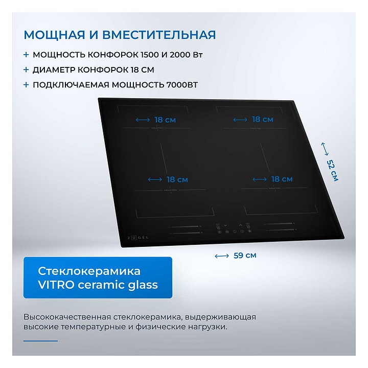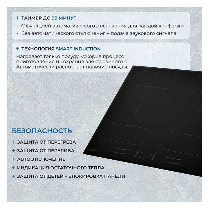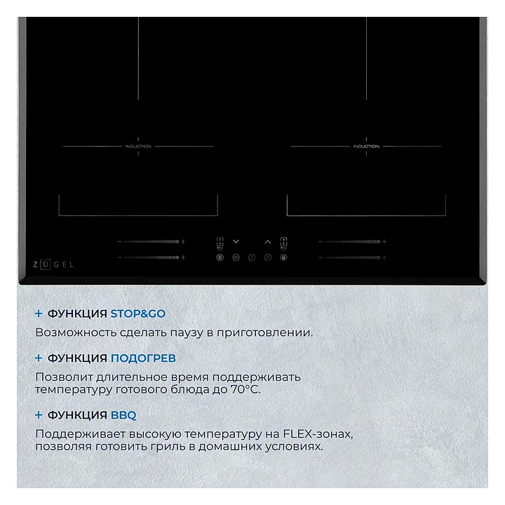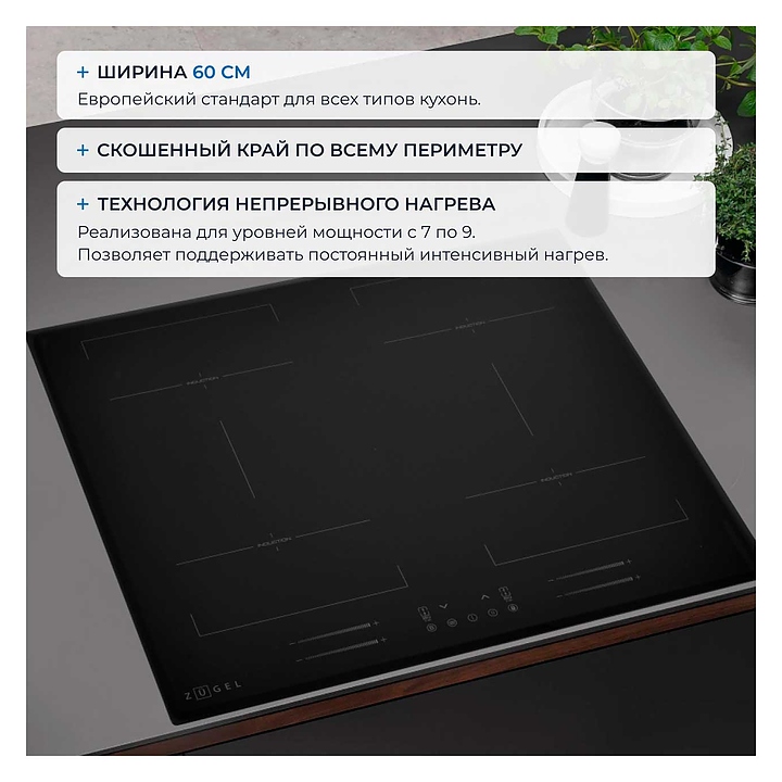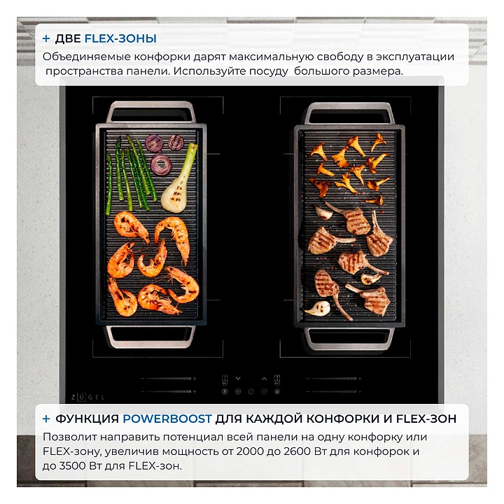 Варочная панель Zugel ZIH619B предназначена для приготовления большого ассортимента блюд в наплитной посуде в домашних условиях. Модель оснащена сенсорным слайдером для каждой конфорки, LED дисплеем, таймером и 2 FLEX-зонами для объединения конфорок и использования посуды большого размера. Индукционная технология Smart Induction обеспечивает передачу до 90% энергии непосредственно посуде, что значительно экономит электроэнергию по сравнению с традиционными плитами. Отсутствие открытого огня и минимальный нагрев окружающей среды делают приготовление пищи более безопасным и комфортным. Режим усиленного нагрева PowerBoost для повышения мощности на одну конфорку или FLEX-зону. Поверхность выполнена из высококачественной стеклокерамики Vitro Ceramic Glass, выдерживающей высокие температурные и физические нагрузки. Особенности: