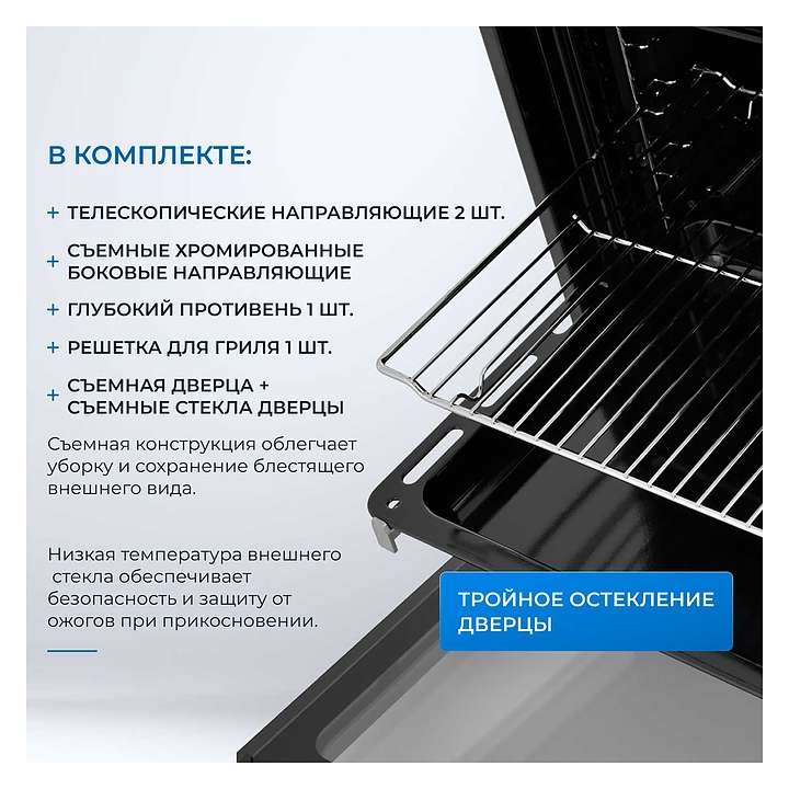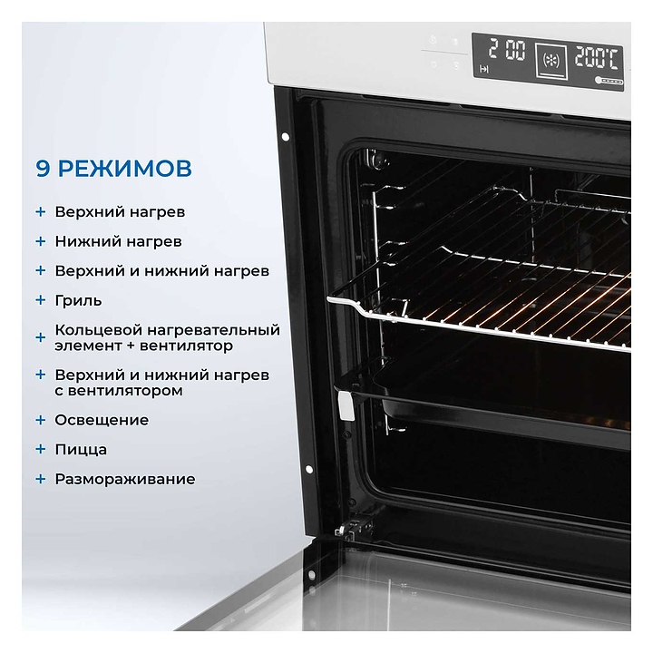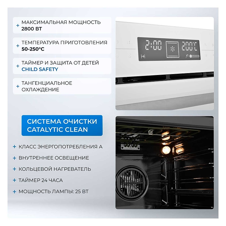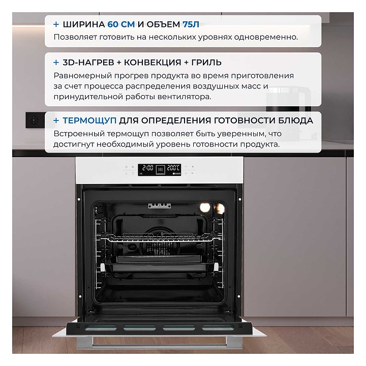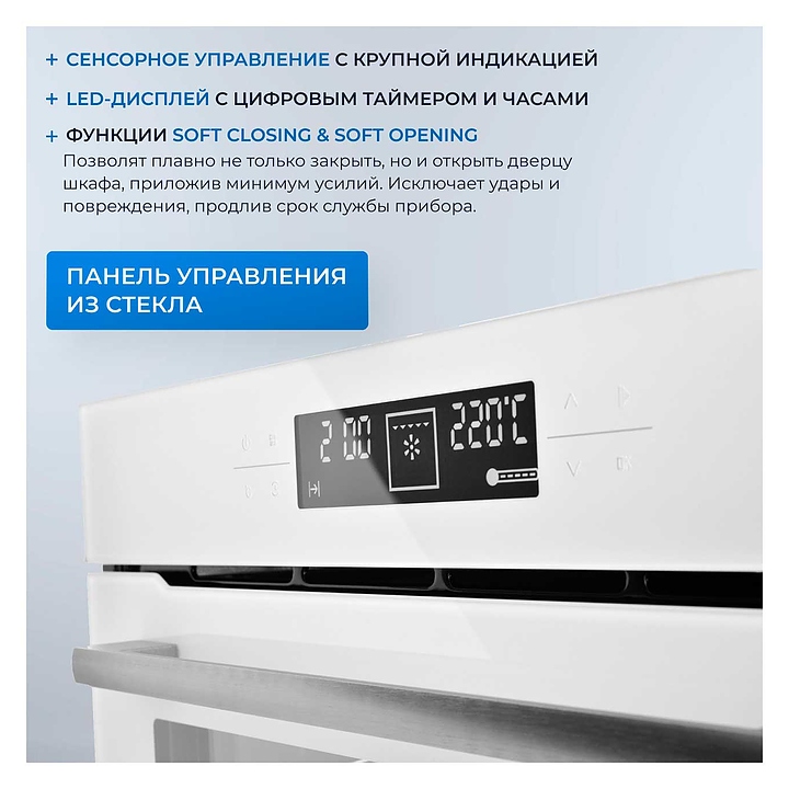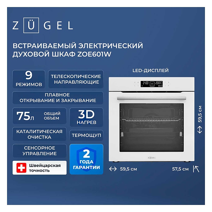 Духовой шкаф Zugel ZOE601W используется в квартирах и частных домах для приготовления широкого спектра блюд из овощей, мяса, птицы и рыбы, а также выпечки десертов и хлебобулочных изделий. Модель оснащена сенсорным управлением с крупной индикацией, LED-дисплеем с цифровым таймером и часами, встроенным термощупом для определения готовности блюда. Каталитическая система очистки гарантирует простой уход. Функции SOFT CLOSING&SOFT OPENING обеспечивают плавныеоткрытие и закрытие дверцы шкафа, приложив минимум усилий, исключая удары и повреждения. Съемные дверца и внутренние стекла позволяют тщательно очистить внутреннюю поверхность. Тройное остекление дверцы гарантирует низкую температуру внешнего стекла, что обеспечивает безопасность и защиту от ожогов при прикосновении. В комплект поставки входят глубокий противень, решетка для гриля, 2 телескопических направляющих и съемные хромированные боковые направляющие. Особенности:
