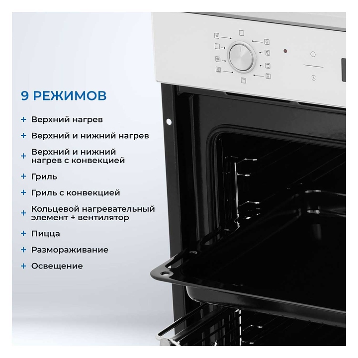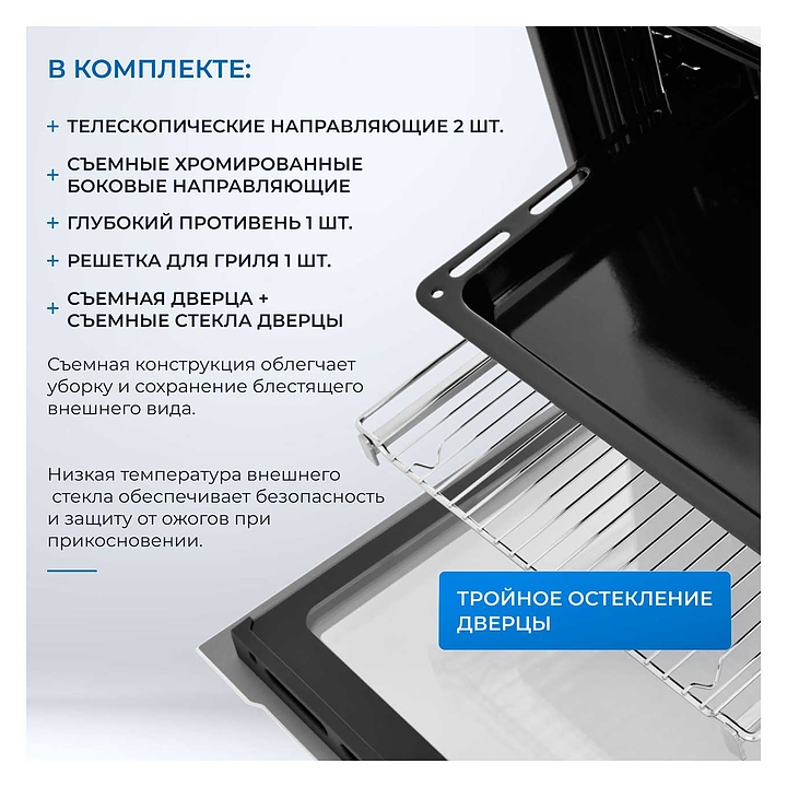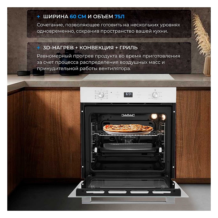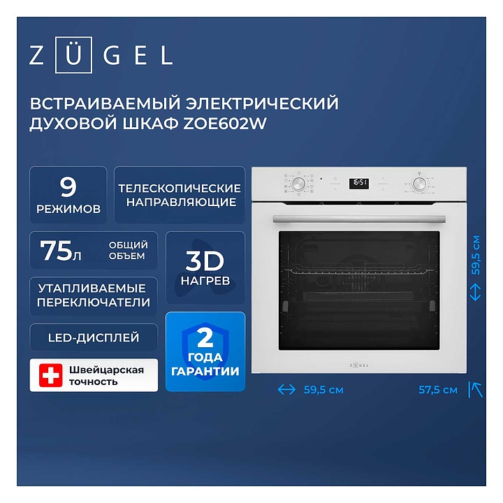 Духовой шкаф Zugel ZOE602W используется в квартирах и частных домах для приготовления широкого спектра блюд из овощей, мяса, птицы и рыбы, а также выпечки десертов и хлебобулочных изделий. Модель оснащена сенсорным управлением, утапливаемыми регуляторами PIPO SWITCH, LED-дисплеем с цифровым таймером и часами. Функции SOFT CLOSING&SOFT OPENING обеспечивают плавныеоткрытие и закрытие дверцы шкафа, приложив минимум усилий, исключая удары и повреждения. Съемные дверца и внутренние стекла позволяют тщательно очистить внутреннюю поверхность. Тройное остекление дверцы гарантирует низкую температуру внешнего стекла, что обеспечивает безопасность и защиту от ожогов при прикосновении. Эмалевое покрытие Easy Clean внутри духовки гарантирует простую очистку. Панель управления выполнена из стекла. В комплект поставки входят глубокий противень, решетка для гриля, 2 телескопические направляющие и съемные боковые направляющие. Особенности: