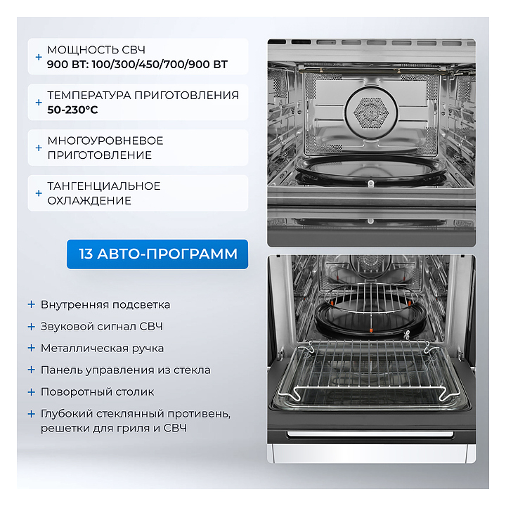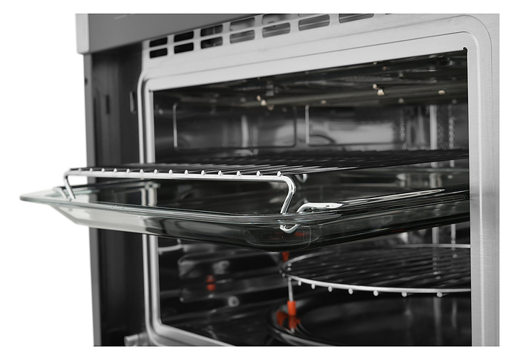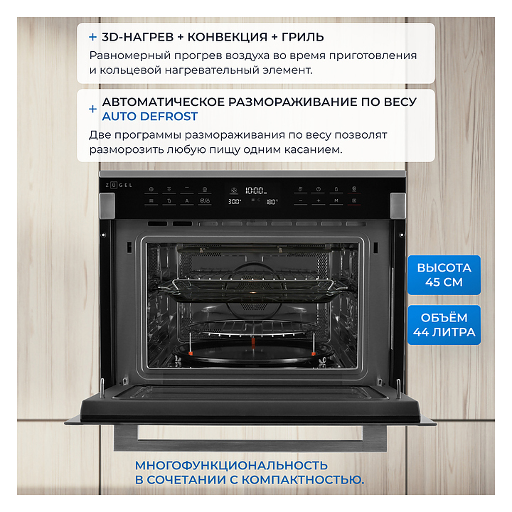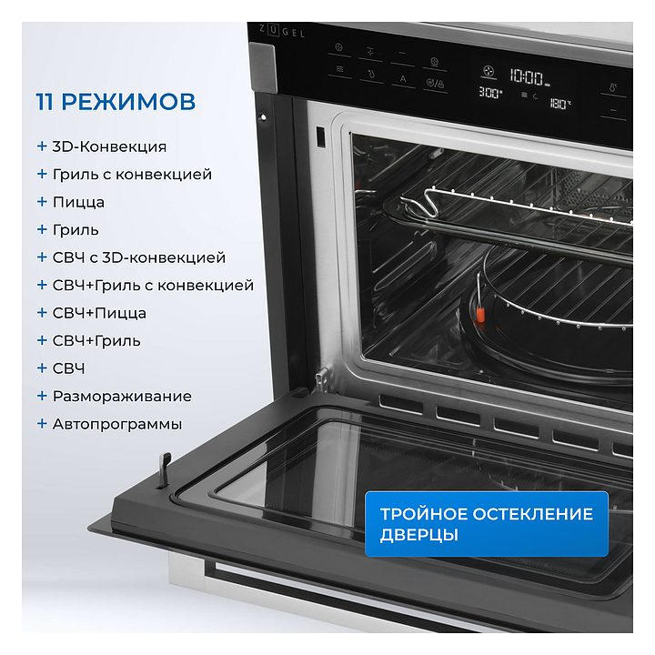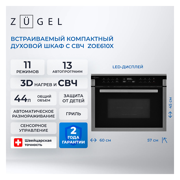 Духовой шкаф Zugel ZOE610X используется в квартирах и частных домах для приготовления широкого спектра блюд из овощей, мяса, птицы и рыбы, а также выпечки десертов и хлебобулочных изделий. Модель оснащена сенсорным управлением SMART Touch, LED-дисплеем, цифровым таймером, часами и СВЧ. Тройное остекление дверцы гарантирует низкую температуру внешнего стекла, что обеспечивает безопасность и защиту от ожогов при прикосновении. Внутреннее покрытие шкафа выполнено из нержавеющей стали, ручка - из металла, панель управления - из стекла. В комплект поставки входят глубокий стеклянный противень и решетки для гриля и СВЧ. Особенности: