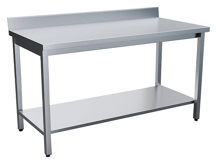 Стол Rada СТППЧ-14/7-С предназначен для обработки продуктов питания, раскатки теста и хранения кухонной техники на предприятиях общественного питания и пищевой промышленности. Модель оснащена регулируемыми по высоте ножками, съемным бортом и сплошной полкой. Каркас выполнен из профильной трубы квадратного сечения нержавеющей стали AISI 430, столешница и полка из нержавеющей стали AISI 430 толщиной 0,8 мм, столешница усилена подложкой из фанеры толщиной 16 мм. Особенности: