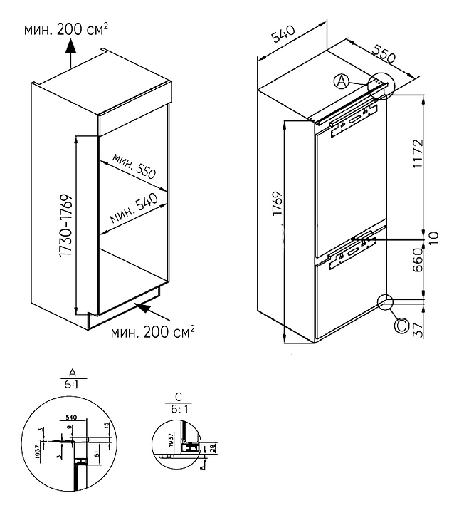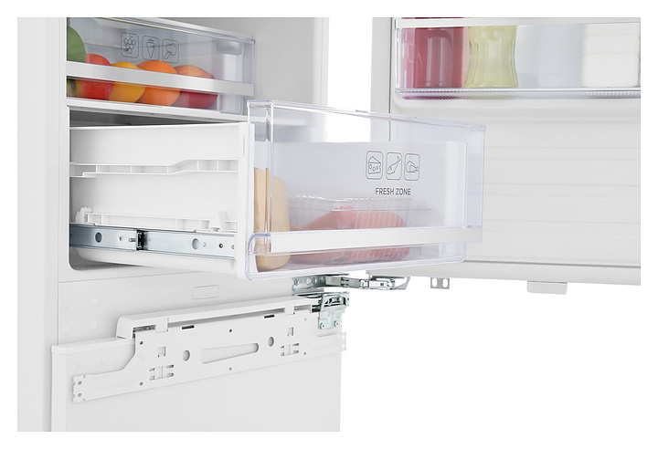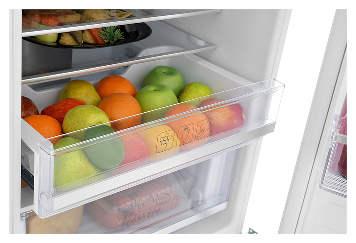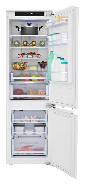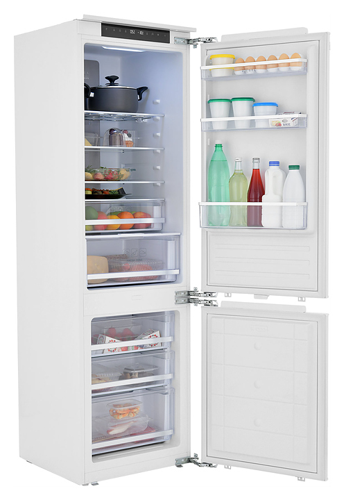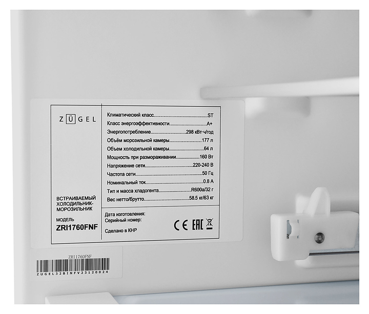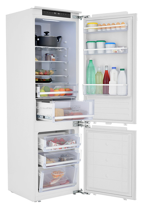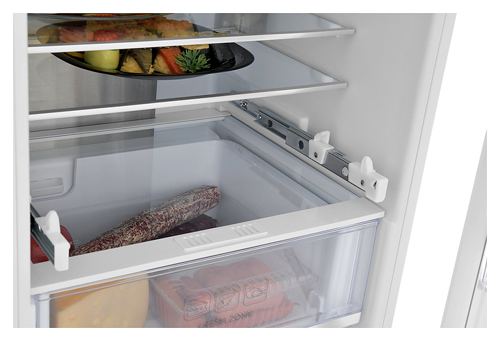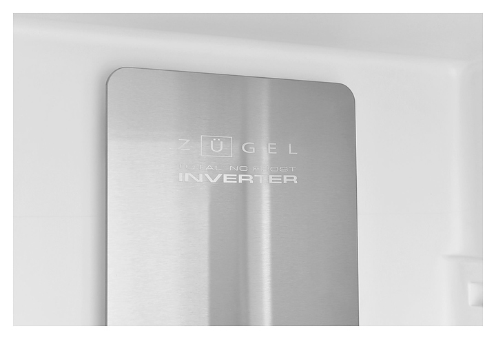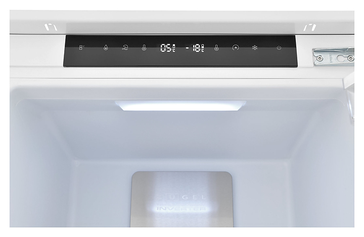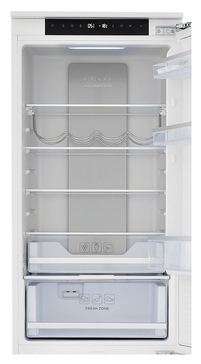 Встраиваемый холодильник Zugel ZRI1760FNF предназначен для охлаждения, замораживания, длительного и кратковременного хранения продуктов питания в частных домах, квартирах, отелях и офисах. Модель оснащена холодильной камерой сверху, морозильной камерой снизу, электронным сенсорным управлением, LED-дисплеем, внутренним светодиодным освещением и регулируемыми ножками. Инверторный компрессор снижает уровень шума, износа и энергопотребления, увеличивает срок службы. Система принудительной циркуляции воздуха No Frost препятствует осаждению на холодных поверхностях влаги с последующей ее кристаллизацией, что не требуют периодического размораживания. Полки выполнены из закаленного стекла, отделка ящиков и полок - из стали. Особенности: