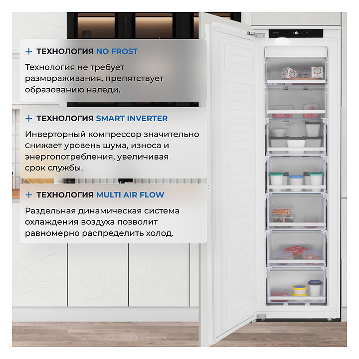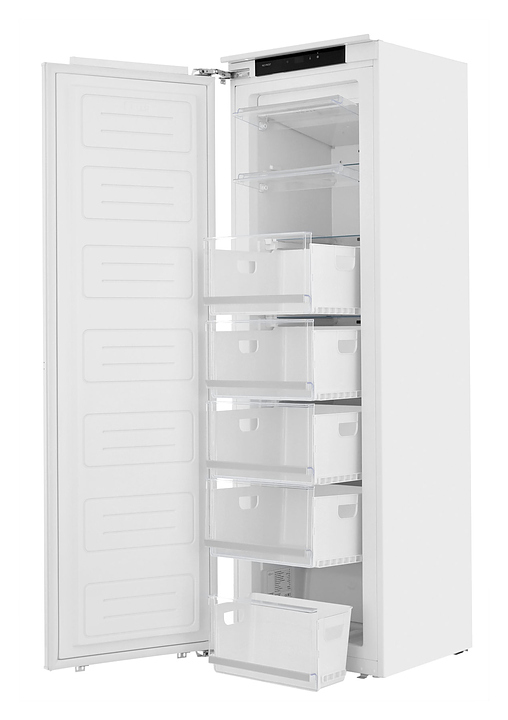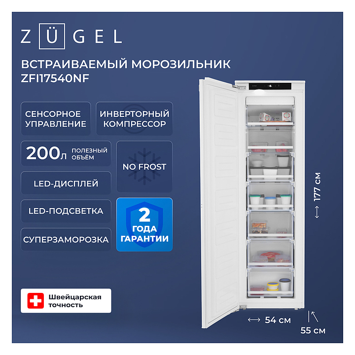 Встраиваемый морозильник Zugel ZFI17540NF предназначен для замораживания и длительного хранения продуктов питания в частных домах, квартирах, отелях и офисах. Модель оснащена электронным сенсорным управлением, LED-дисплеем, внутренним светодиодным освещением и регулируемыми ножками. Инверторный компрессор снижает уровень шума, износа и энергопотребления, увеличивает срок службы. Система принудительной циркуляции воздуха No Frost препятствует осаждению на холодных поверхностях влаги с последующей ее кристаллизацией, что не требуют периодического размораживания. Полки и ящики выполнены из закаленного стекла, отделка - из стали. Особенности: