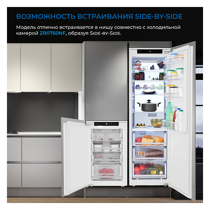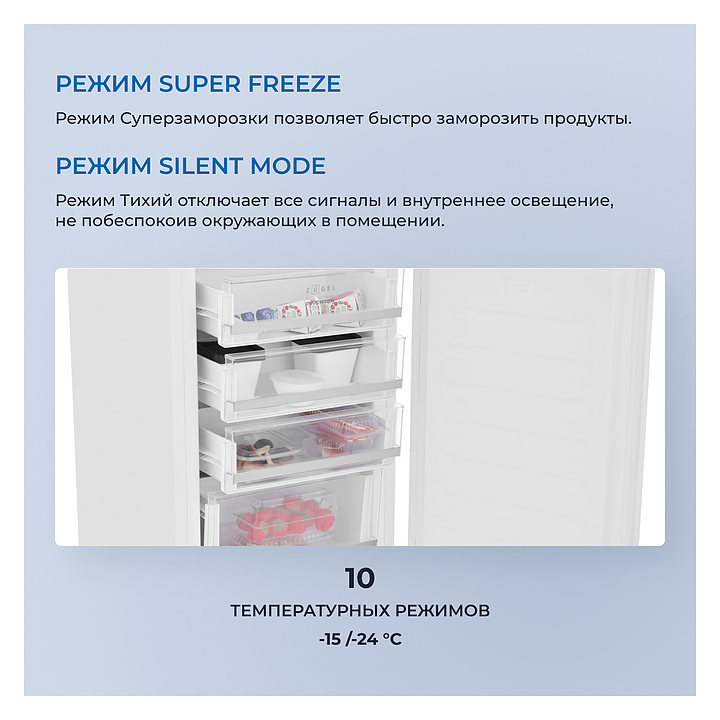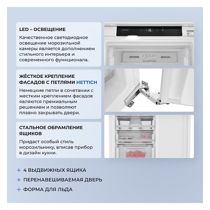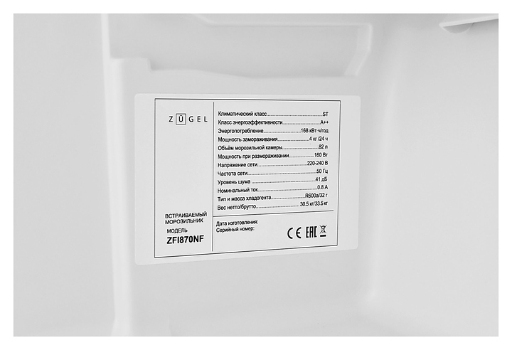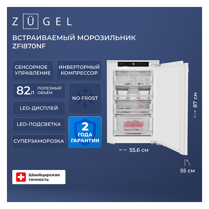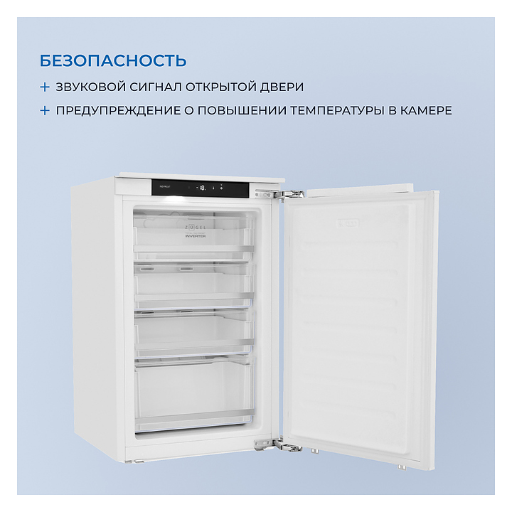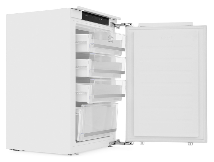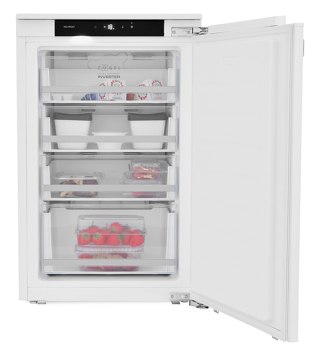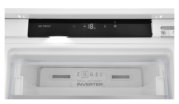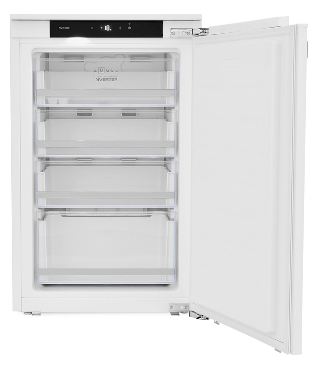 Встраиваемый морозильник Zugel ZFI870NF предназначен для замораживания и длительного хранения продуктов питания в частных домах, квартирах, отелях и офисах. Модель оснащена электронным сенсорным управлением, LED-дисплеем, внутренним светодиодным освещением и регулируемыми ножками. Инверторный компрессор снижает уровень шума, износа и энергопотребления, увеличивает срок службы. Система принудительной циркуляции воздуха No Frost препятствует осаждению на холодных поверхностях влаги с последующей ее кристаллизацией, что не требуют периодического размораживания. Полки и ящики выполнены из закаленного стекла, отделка - из стали. Особенности: