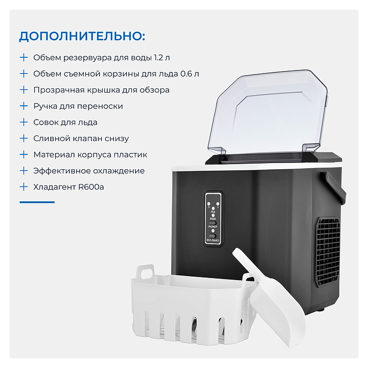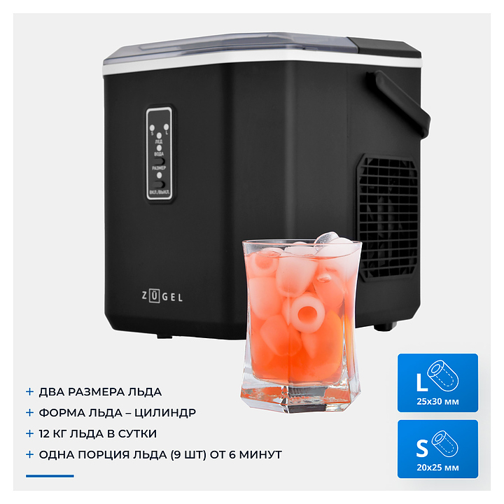 Льдогенератор Zugel ZIM1201 предназначен для получения пальчикового льда, который используется для приготовления разнообразных коктейлей, алкогольных и прохладительных напитков в частных домах, квартирах, отелях и офисах. Модель оснащена электронным управлением, LED-индикаторами, прозрачной крышкой для контроля за процессом приготовления и ручкой для переноски. Корпус выполнен из PP-пластика, пенообразователь - циклопентан. Особенности: