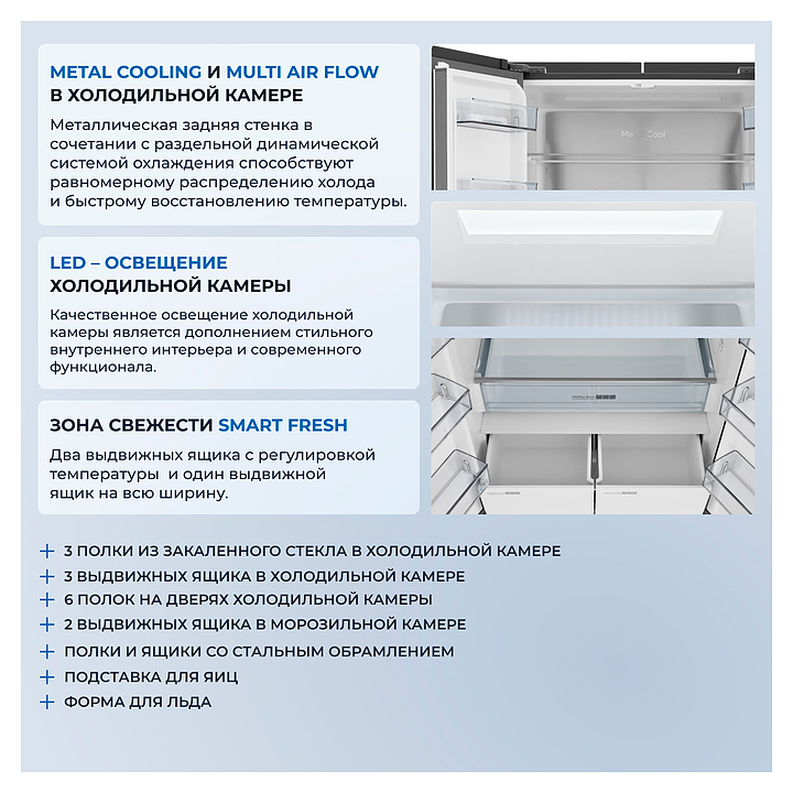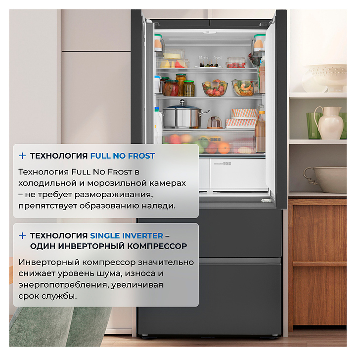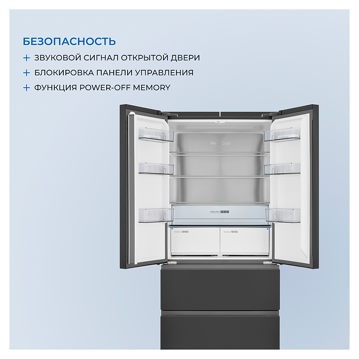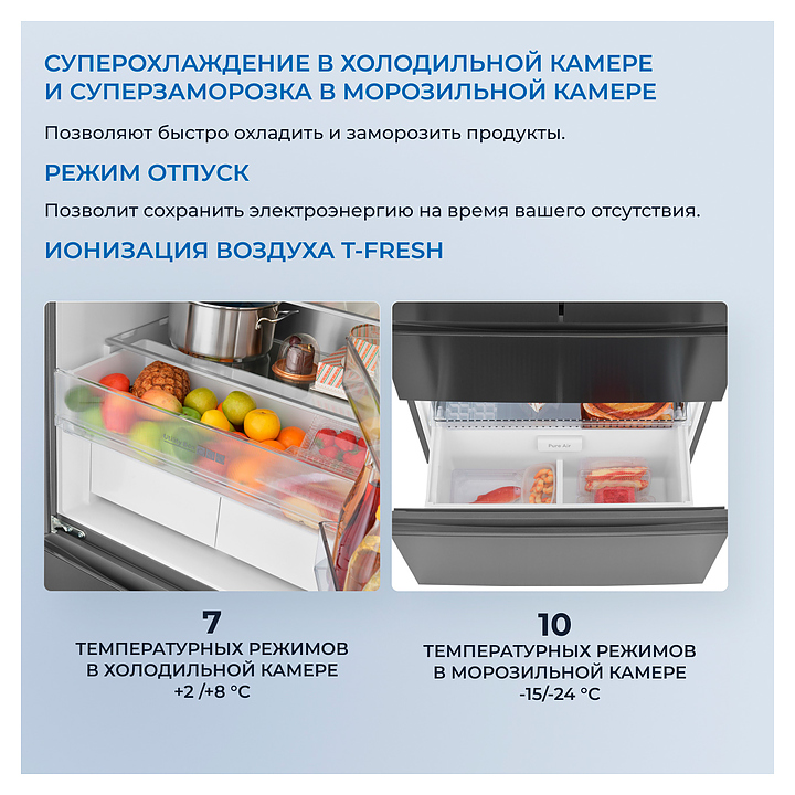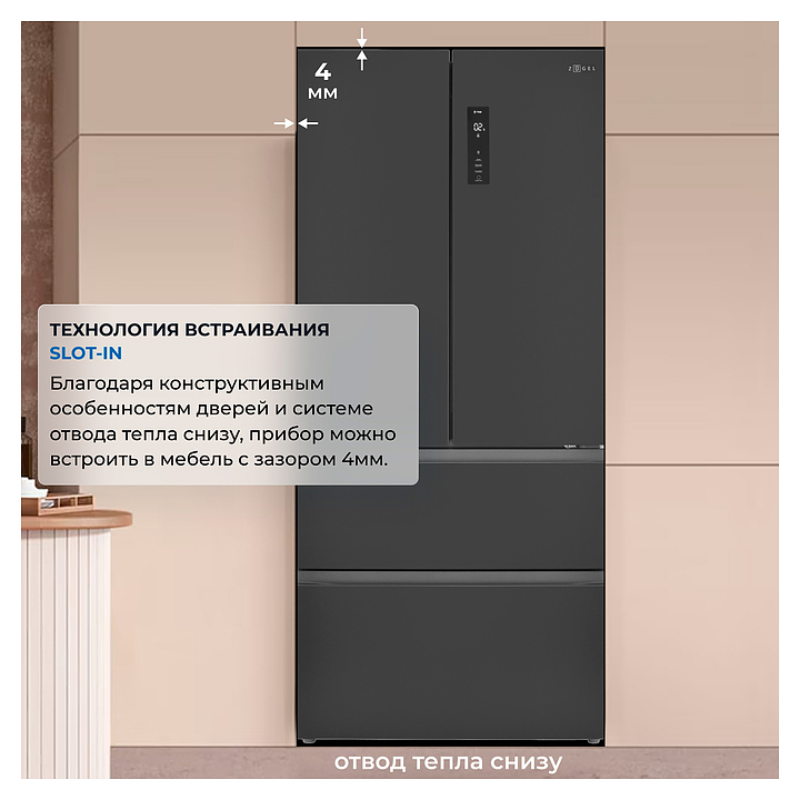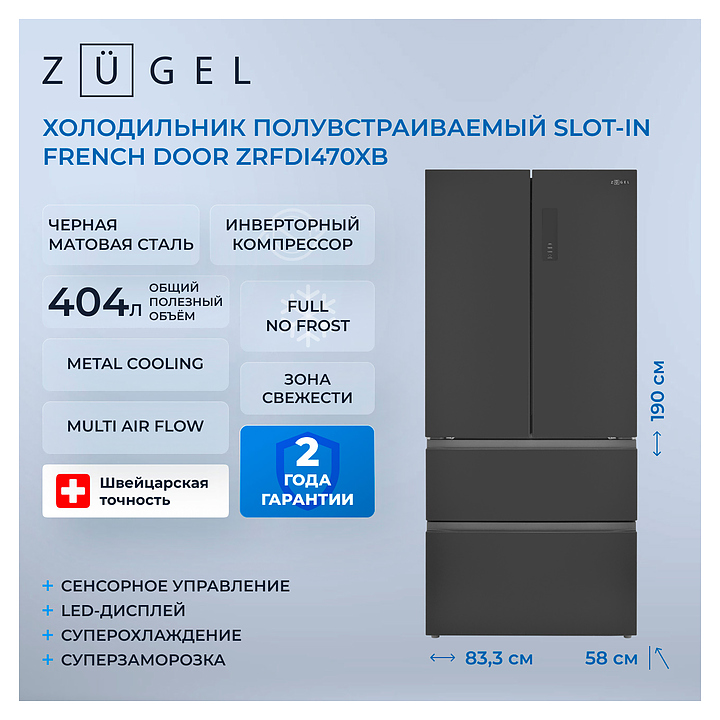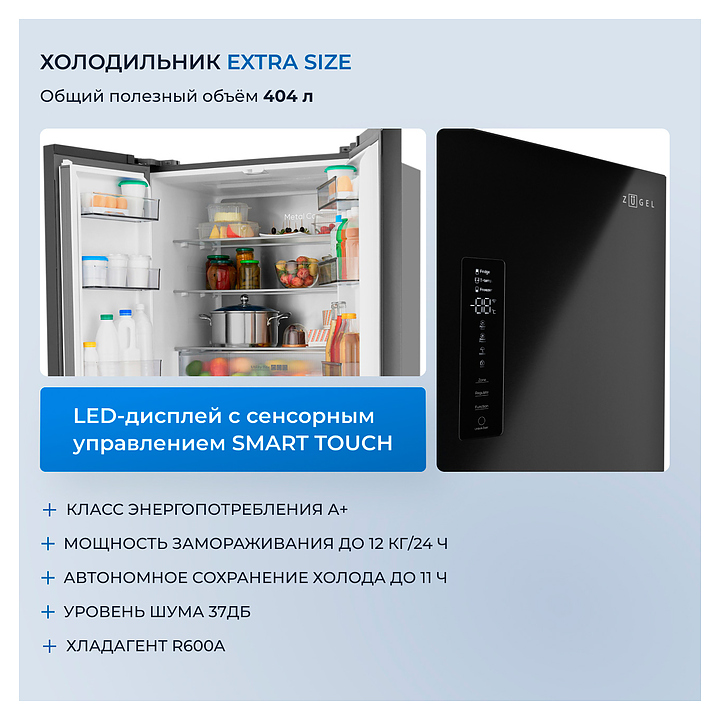 Холодильник Zugel ZRFDI470XB предназначен для охлаждения, замораживания, кратковременного и длительного хранения продуктов питания в частных домах, квартирах, отелях и офисах. Модель оснащена холодильной камерой сверху морозильной камерой снизу, электронным управлением, сенсорным LED-дисплеем с расширенной индикацией, внутренним светодиодным освещением и регулируемыми ножками. Система охлаждения No Frost предотвращает образование льда и инея внутри холодильной и морозильной камер, что упрощает обслуживание, экономит энергию и поддерживает оптимальные условия для хранения продуктов. Фасад выполнен из брашированной стали, полки - из закаленного стекла, пенообразователь - циклопентан. Особенности: