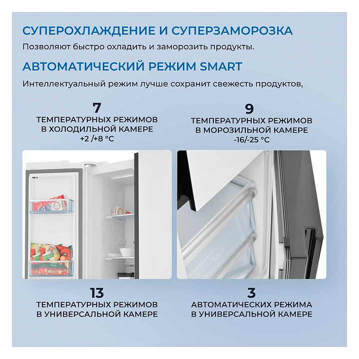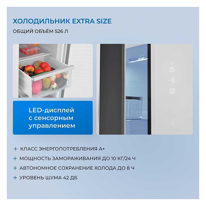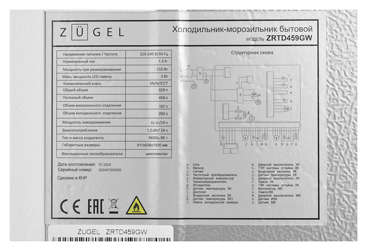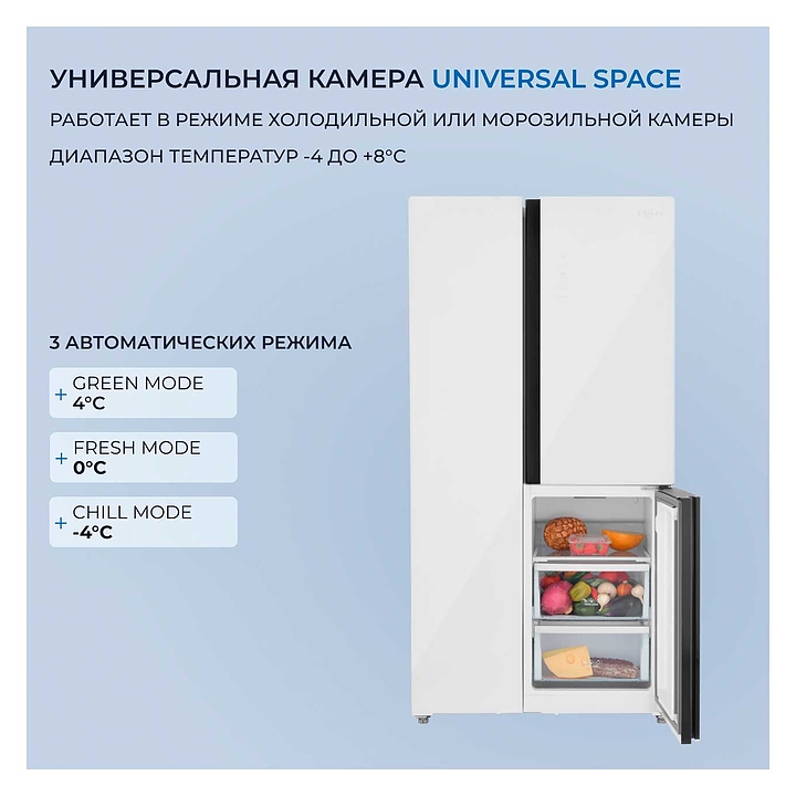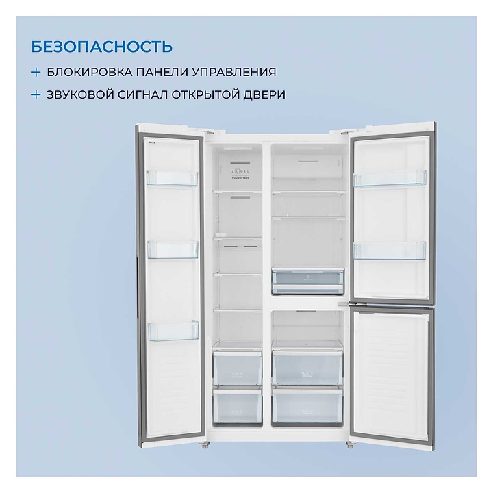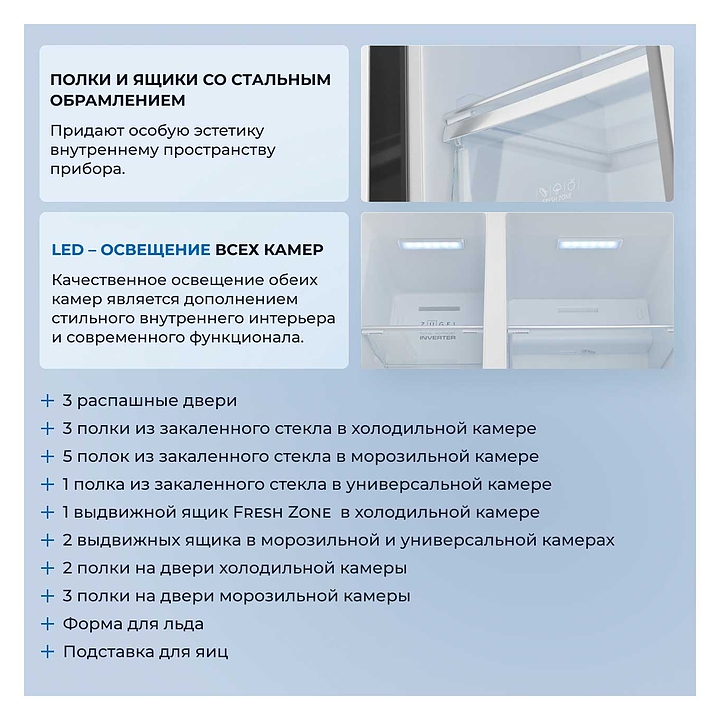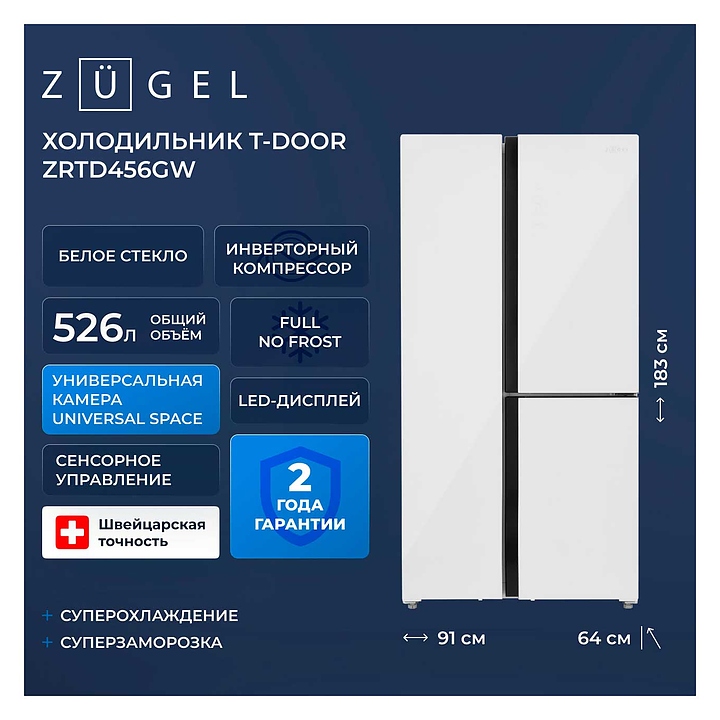 Холодильник Zugel ZRTD459GW предназначен для охлаждения, замораживания, кратковременного и длительного хранения продуктов питания в частных домах, квартирах, отелях и офисах. Модель оснащена 3 распашными дверьми, сенсорным управлением, LED-дисплеем и внутренним светодиодным освещением. Система охлаждения No Frost предотвращает образование льда и инея внутри холодильной и морозильной камер, что упрощает обслуживание, экономит энергию и поддерживает оптимальные условия для хранения продуктов. Фасад выполнен из стекла, полки - из закаленного стекла. Особенности: