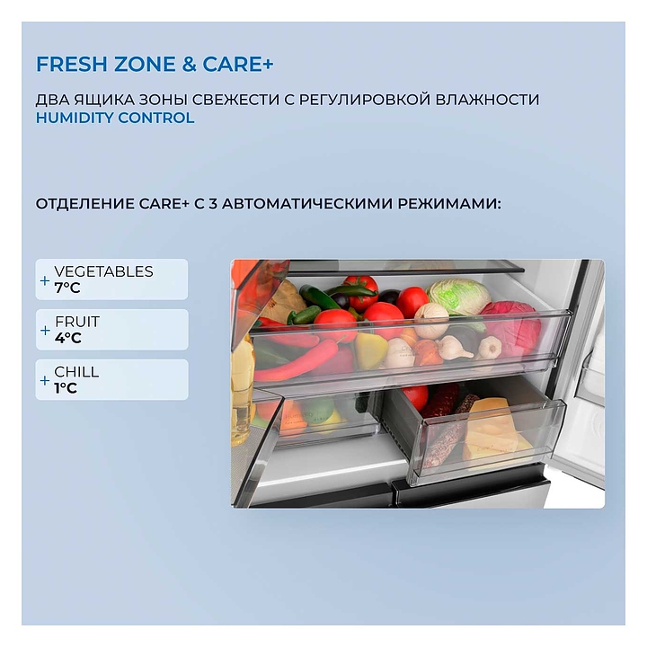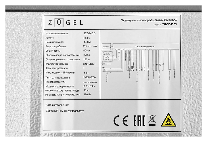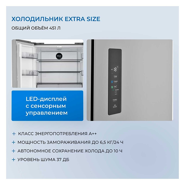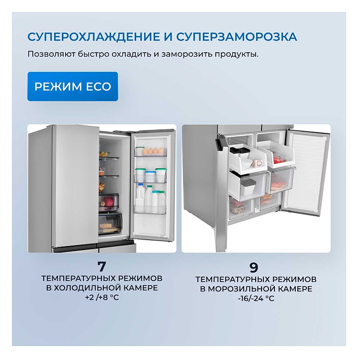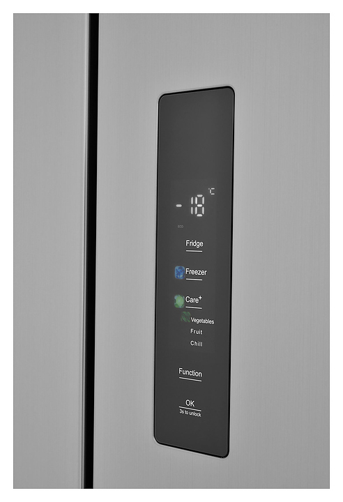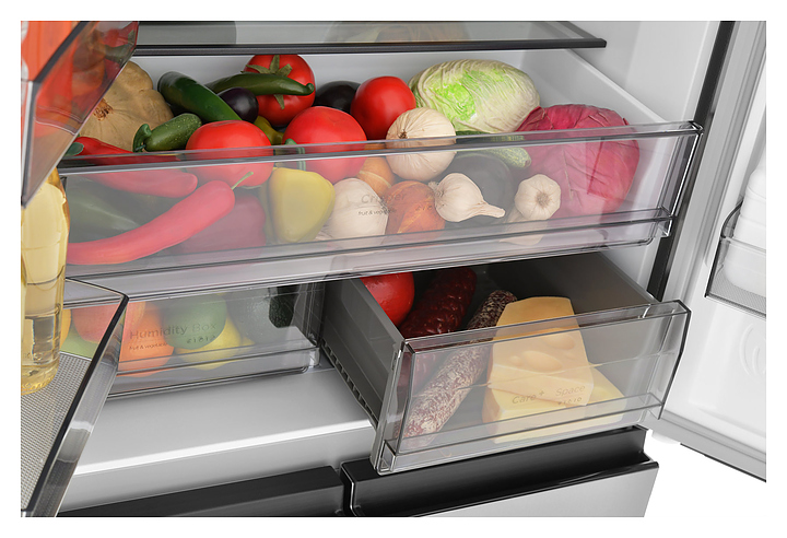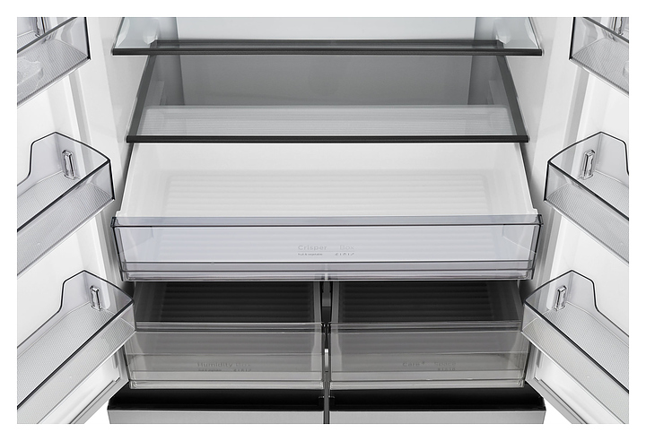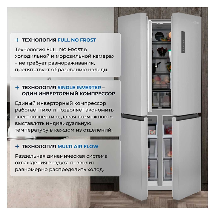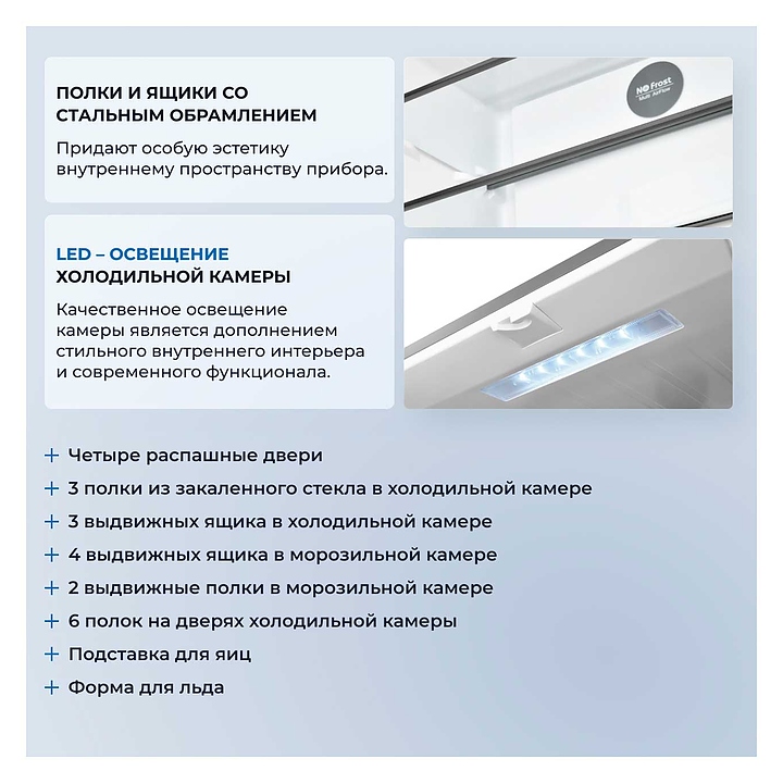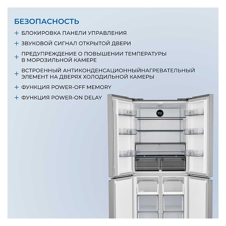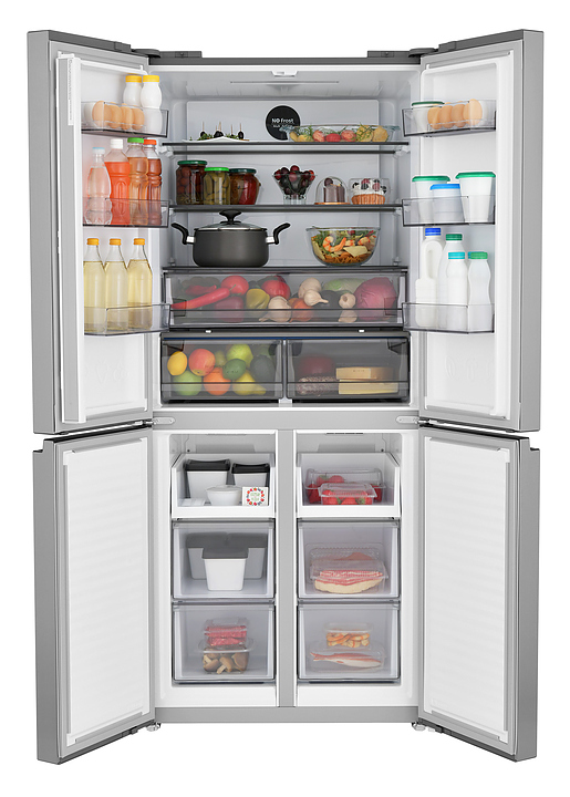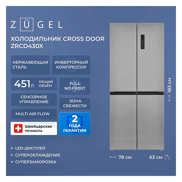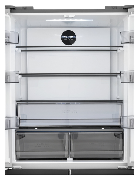 Холодильник Zugel ZRCD430X предназначен для охлаждения, замораживания, кратковременного и длительного хранения продуктов питания в частных домах, квартирах, отелях и офисах. Модель оснащена 4 распашными дверьми, сенсорным управлением, сенсорным LED-дисплеем с индикацией температуры и внутренним светодиодным освещением. Система охлаждения No Frost предотвращает образование льда и инея внутри холодильной и морозильной камер, что упрощает обслуживание, экономит энергию и поддерживает оптимальные условия для хранения продуктов. Встроенный антиконденсационный нагревательный элемент предотвращает образование конденсата на перегородке между холодильной и морозильной камерами. Фасад выполнен из брашированной стали, полки - из закаленного стекла, отделка полок и ящиков - из стали. Особенности: