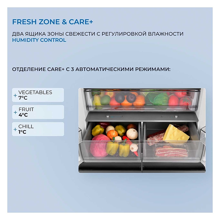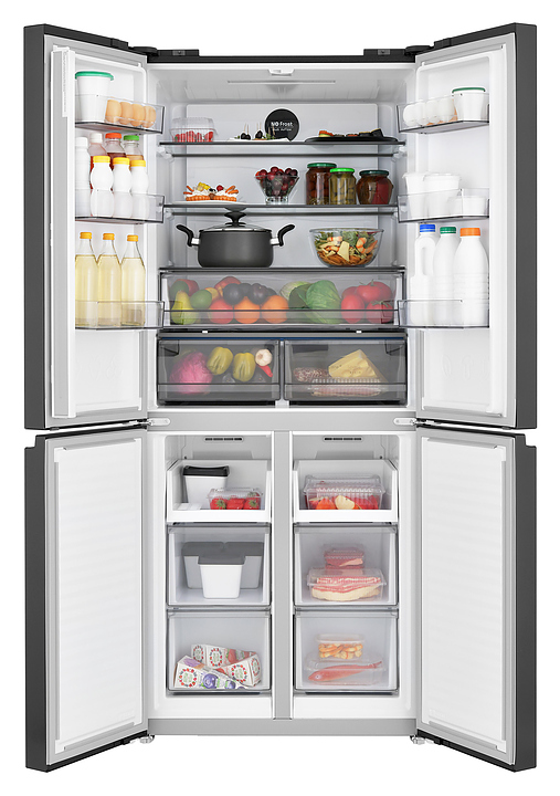 Холодильник Zugel ZRCD430B предназначен для охлаждения, замораживания, кратковременного и длительного хранения продуктов питания в частных домах, квартирах, отелях и офисах. Модель оснащена 4 распашными дверьми, сенсорным управлением, сенсорным LED-дисплеем с индикацией температуры и внутренним светодиодным освещением. Система охлаждения No Frost предотвращает образование льда и инея внутри холодильной и морозильной камер, что упрощает обслуживание, экономит энергию и поддерживает оптимальные условия для хранения продуктов. Встроенный антиконденсационный нагревательный элемент предотвращает образование конденсата на перегородке между холодильной и морозильной камерами. Фасад выполнен из брашированной стали, полки - из закаленного стекла, отделка полок и ящиков - из стали. Особенности: