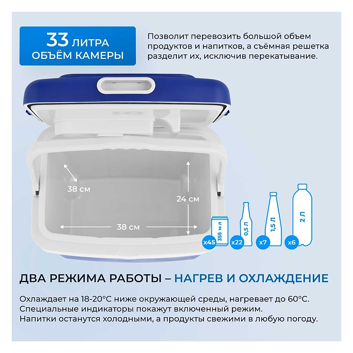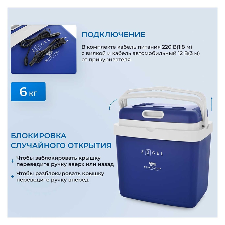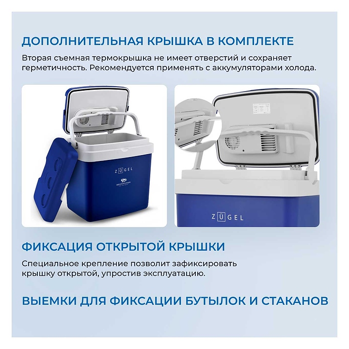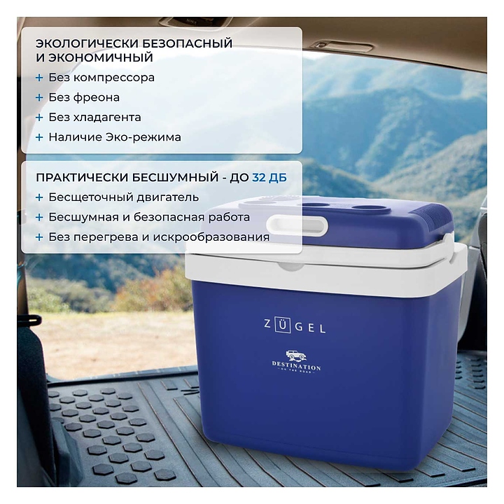 Автохолодильник Zugel ZCR33 предназначен для охлаждения, нагревания, хранения и транспортировки продуктов питания и напитков в автомобилях, автодомах, лодках, в путешествиях, походах, на пикниках или во время кемпинга. Модель оснащена электронным управлением, выемкой для фиксации высоких бутылок и ручкой для переноски. Бесщеточный двигатель гарантирует бесшумную работу без перегрева и искрообразования. Специальное крепление позволит зафиксировать крышку открытой для комфортной эксплуатации. Дополнительная съемная цельная термокрышка предназначена для дольшего сохранения температуры и устанавливается при применении аккумуляторов холода. Корпус выполнен из PР-пластика с теплоизоляцией из полиуретановой пены. В комплект поставки входят кабель питания 220 В с вилкой и автомобильный кабель 12 В от прикуривателя. Особенности: