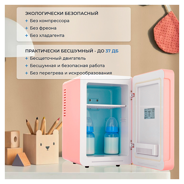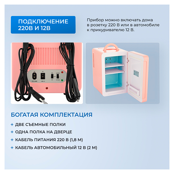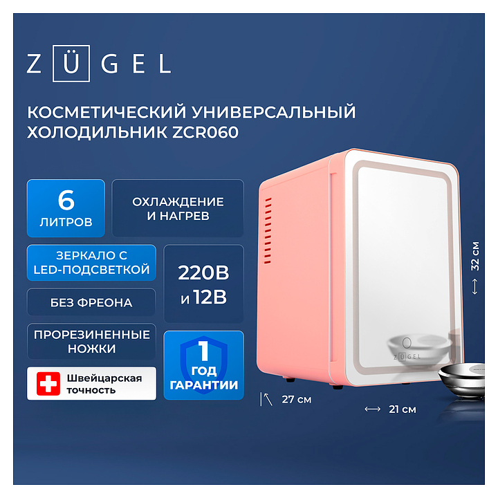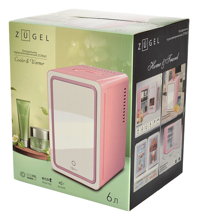 Холодильник Zugel ZCR060 используется в специализированных салонах, офисах, гостиницах и в домашних условиях для хранения и транспортировки широкого спектра косметических средств с ограниченным сроком годности, для охлаждения пищевых продуктов и сохранения тепла в режиме нагрева необходимых материалов и продуктов. Модель оснащена вертикально ориентированной камерой, сенсорным управлением, 2 полками, складной ручкой для переноски и зеркальной дверцей с LED-подсветкой для проведения косметических процедур и нанесения макияжа. Бесщеточный двигатель гарантирует бесшумную работу без перегрева и искрообразования. Корпус выполнен из прочного ABS-пластика, изоляция - из пенополиуретана, ножки - из резины. В комплект поставки входят сетевой и автомобильный кабели питания. Особенности: