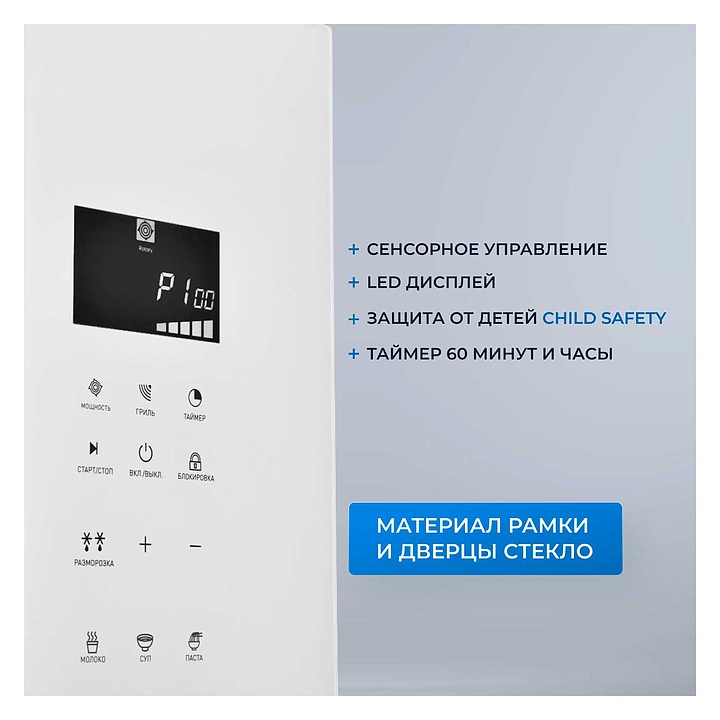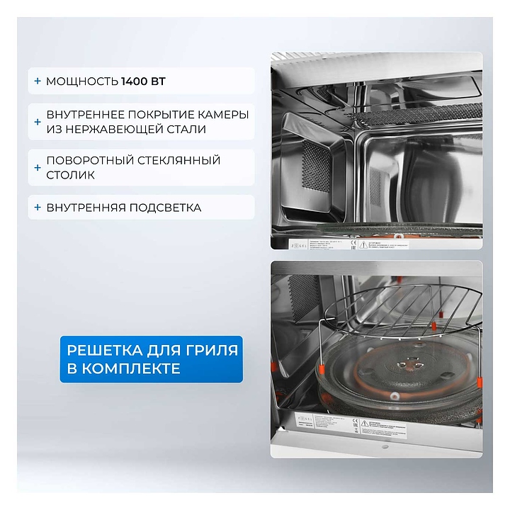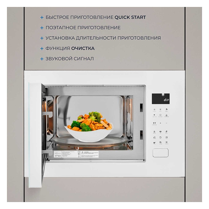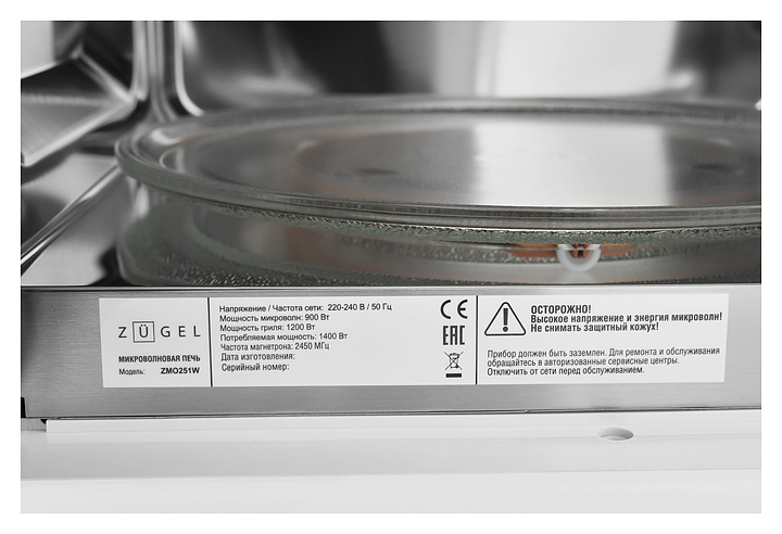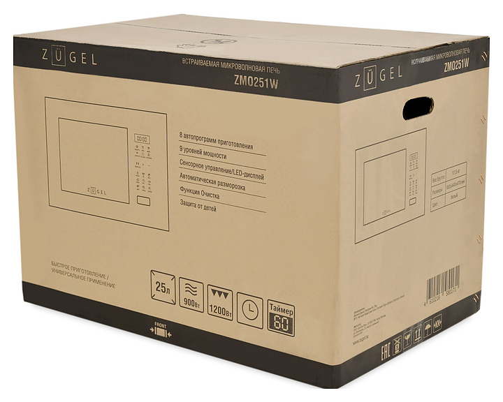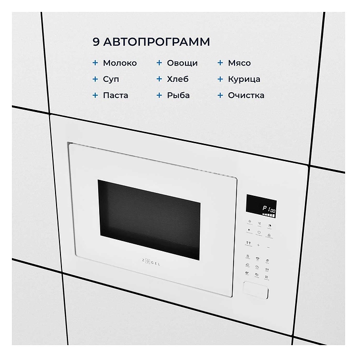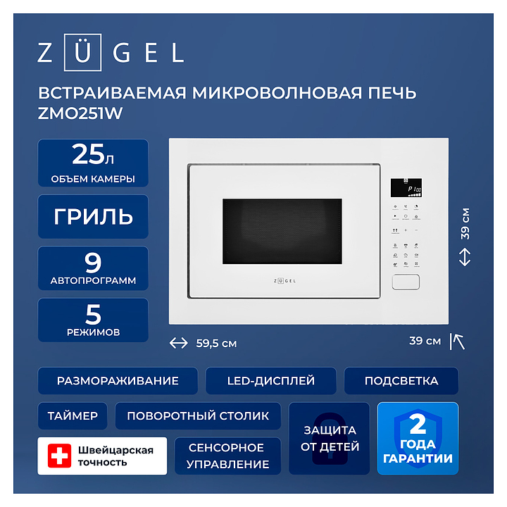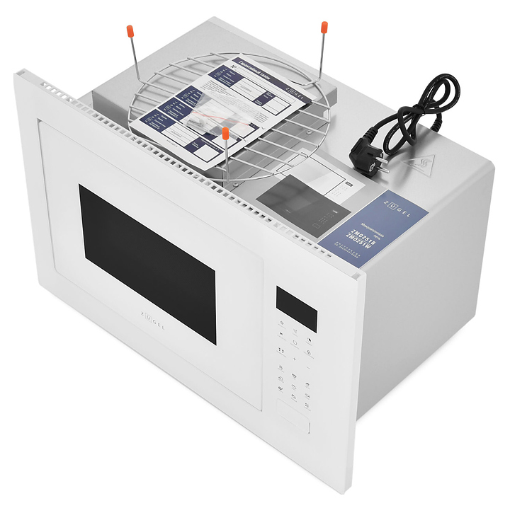 Встраиваемая микроволновая печь Zugel ZMO251W предназначена для приготовления пищи, подогрева готовых блюд и ингредиентов, а также размораживания полуфабрикатов в частных домах, квартирах, отелях и офисах. Модель оснащена электронным управлением с сенсорными кнопками, LED дисплеем, часами, таймером и внутренним освещением. Внутреннее покрытие выполнено из нержавеющей стали, дверца и внешняя рамка - из стекла. В комплект поставки входят стеклянный поворотный стол и решетка для гриля. Особенности: