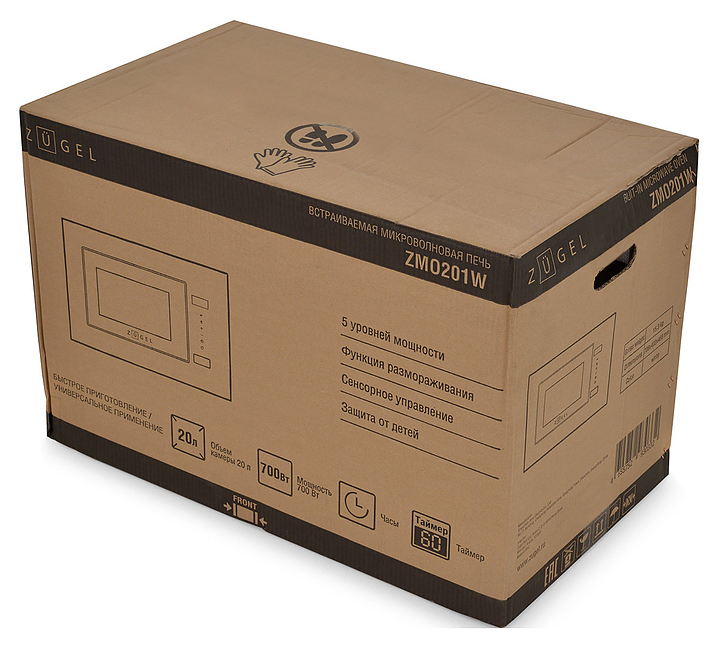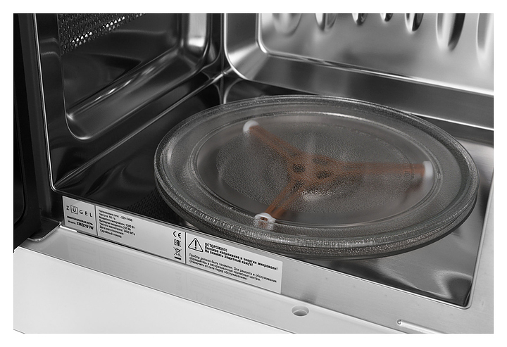 Встраиваемая микроволновая печь Zugel ZMO201W предназначена для приготовления пищи, подогрева готовых блюд и ингредиентов, а также размораживания полуфабрикатов в частных домах, квартирах, отелях и офисах. Модель оснащена электронным управлением с сенсорными кнопками, LED дисплеем, часами и таймером. Внутреннее покрытие выполнено из нержавеющей стали, дверца, поворотный стол и внешняя рамка - из стекла.