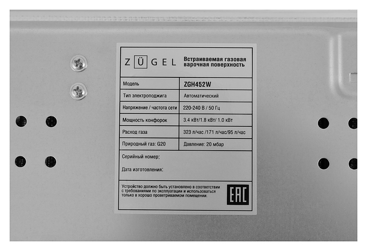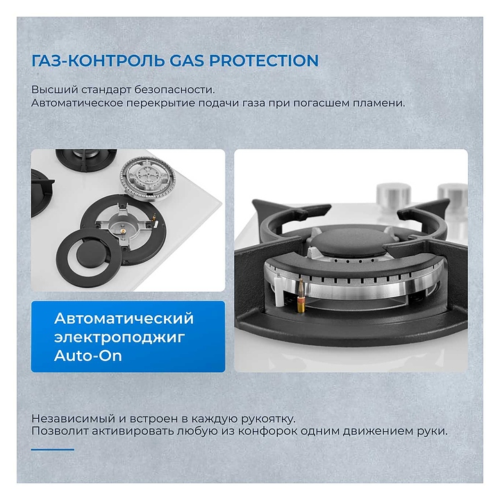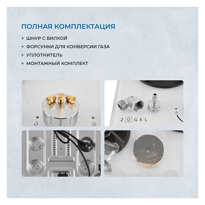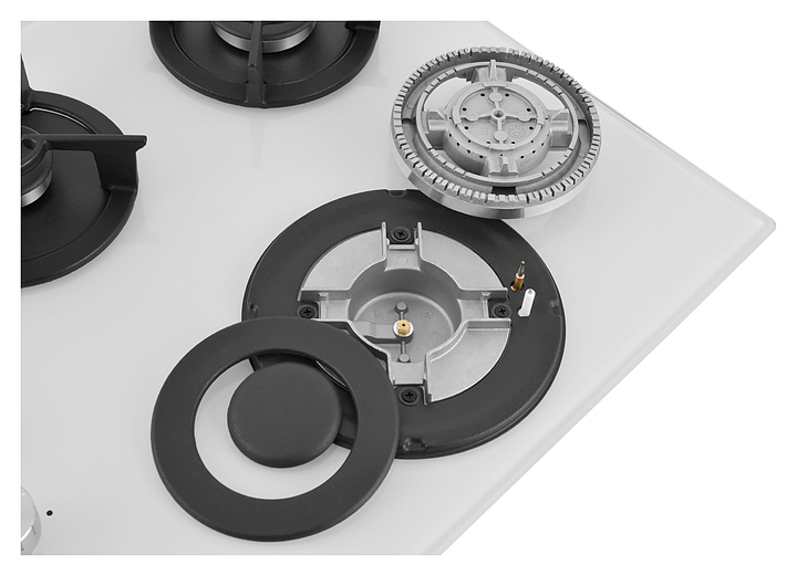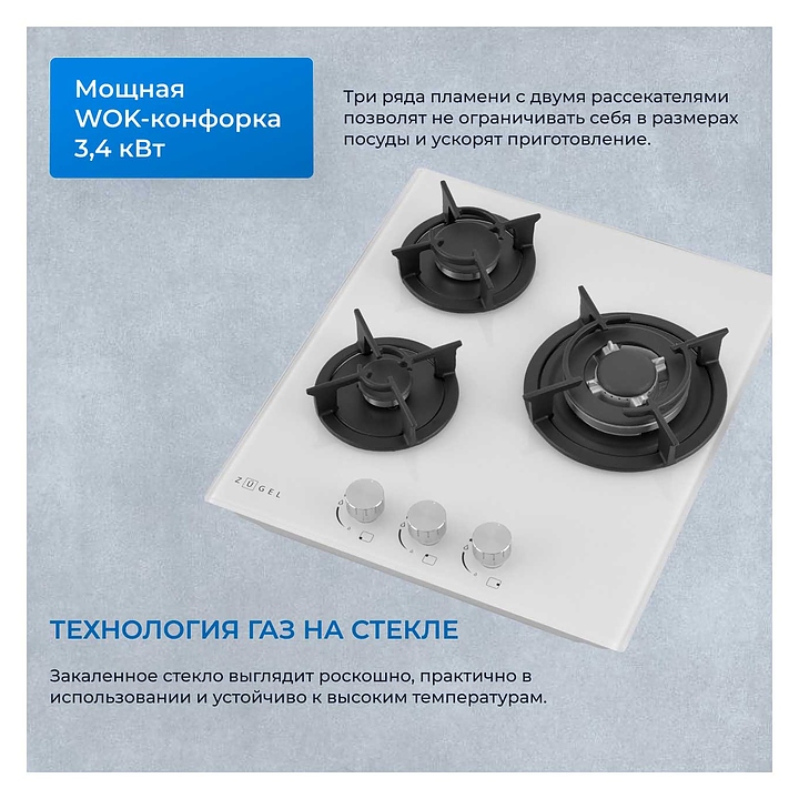Варочная панель Zugel ZGH452W предназначена для приготовления большого ассортимента блюд в наплитной посуде в домашних условиях. Модель оснащена механическим управлением, 3 конфорками разной мощности, автоматическим электроподжигом Auto-On и рукоятками Steel Design. Газ-контроль Gas Protection автоматически перекрывает подачу газа при погасшем пламени. Мощная Вок-конфорка с 2 рассекателями и тройным контуром огня создает сильное пламя для приготовления в посуде большого объема. Рабочая поверхность выполнена из закаленного стекла, решетки - из чугуна, рукоятки - из металла. В комплект поставки входят шнур с вилкой, форсунки для конверсии газа, уплотнитель и монтажный комплект. Особенности: