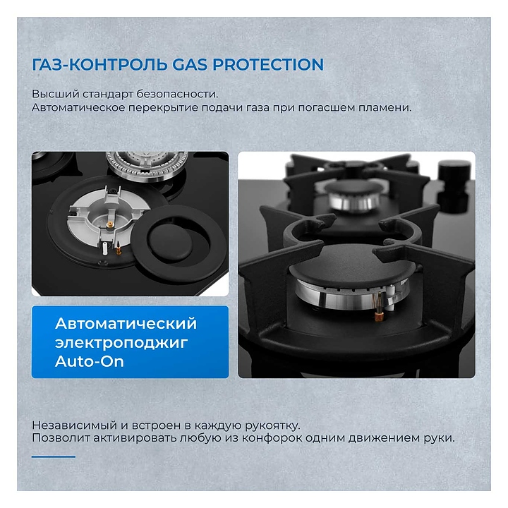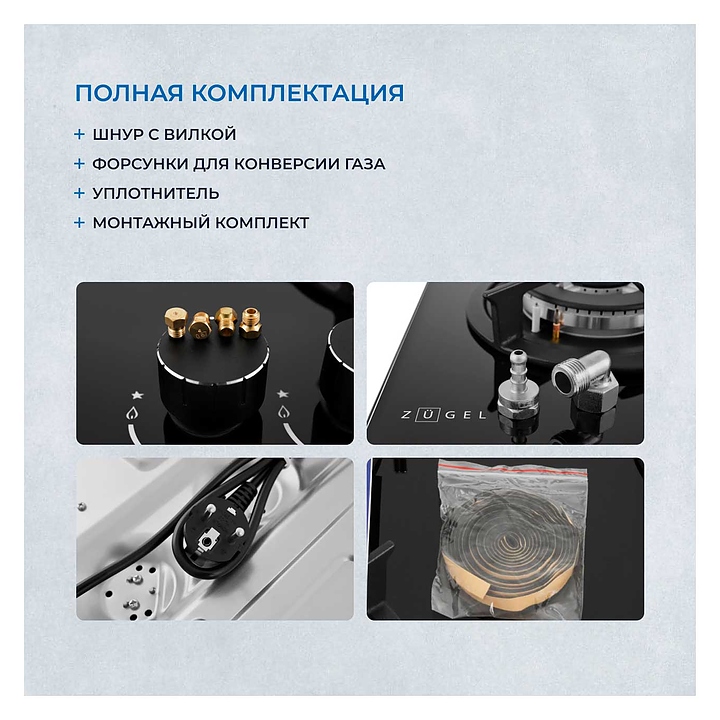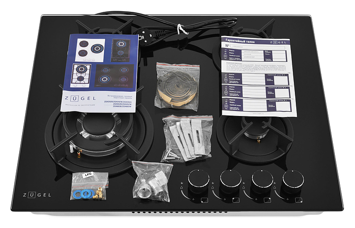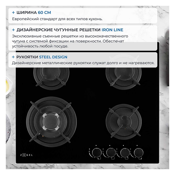 Варочная панель Zugel ZGH603B предназначена для приготовления большого ассортимента блюд в наплитной посуде в домашних условиях. Модель оснащена механическим управлением, 4 конфорками разной мощности, автоматическим электроподжигом Auto-On и рукоятками Steel Design. Газ-контроль Gas Protection автоматически перекрывает подачу газа при погасшем пламени. Мощная Вок-конфорка с 2 рассекателями и тройным контуром огня создает сильное пламя для приготовления в посуде большого объема. Рабочая поверхность выполнена из закаленного стекла, решетки - из чугуна, рукоятки - из металла. В комплект поставки входят шнур с вилкой, форсунки для конверсии газа, уплотнитель и монтажный комплект. Особенности: