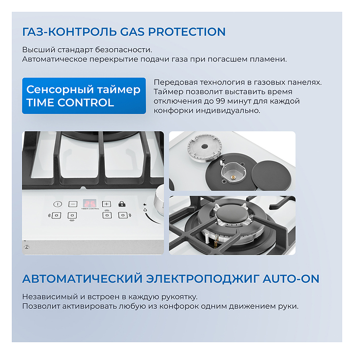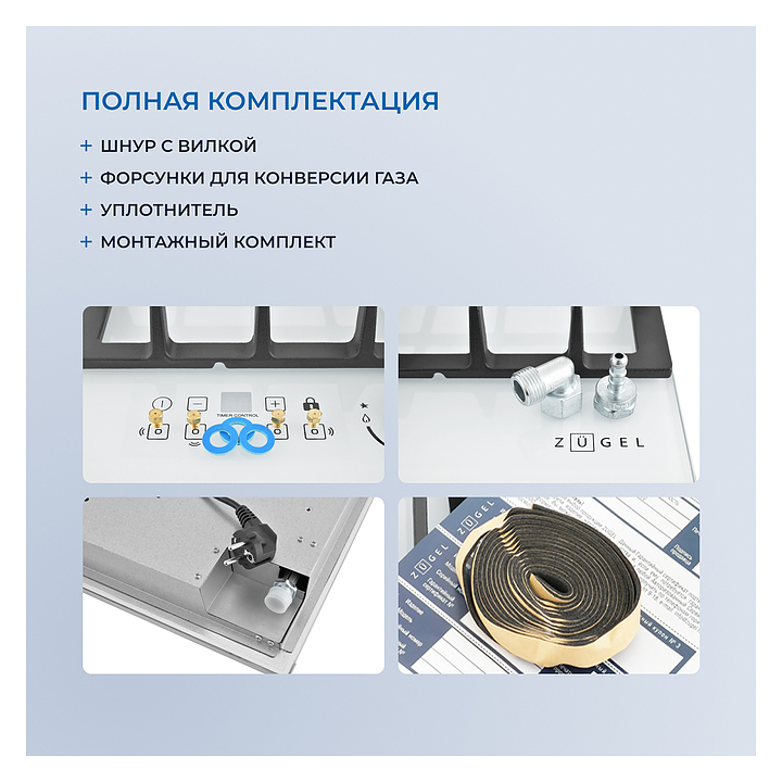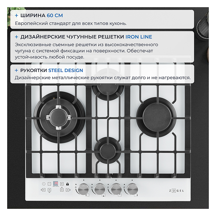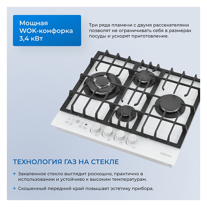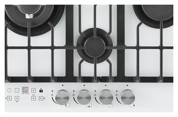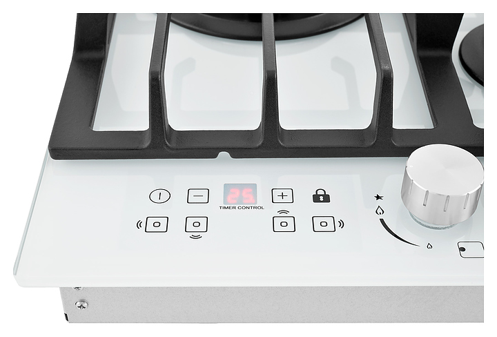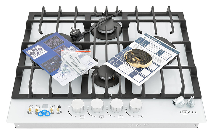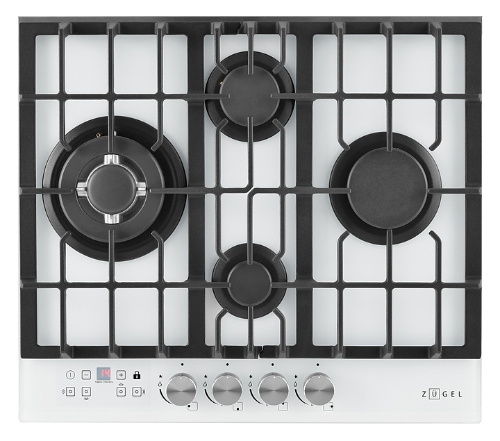 Варочная панель Zugel ZGH600W предназначена для приготовления большого ассортимента блюд в наплитной посуде в домашних условиях. Модель оснащена механическим управлением, 4 конфорками разной мощности, электронным таймером, автоматическим электроподжигом Auto-On и рукоятками Steel Design. Газ-контроль Gas Protection автоматически перекрывает подачу газа при погасшем пламени. Мощная Вок-конфорка с 2 рассекателями и тройным контуром огня создает сильное пламя для приготовления в посуде большого объема. Рабочая поверхность выполнена из закаленного стекла, решетки - из чугуна, рукоятки - из стали. В комплект поставки входят шнур с вилкой, форсунки для конверсии газа, уплотнитель и монтажный комплект. Особенности: