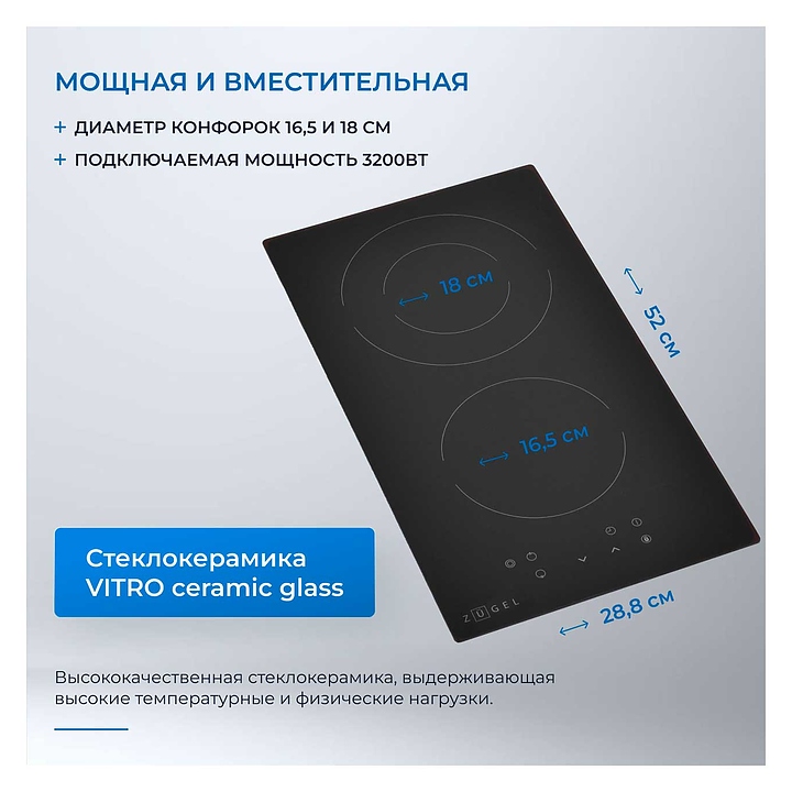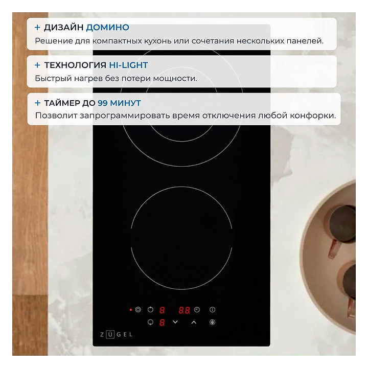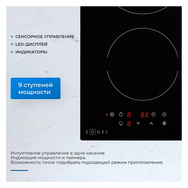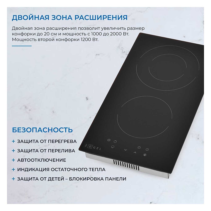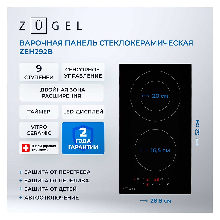 Варочная панель Zugel ZEH292B предназначена для приготовления большого ассортимента блюд в наплитной посуде в домашних условиях. Модель оснащена сенсорным управлением, LED-дисплеем, индикаторами мощности и времени. Технология HI-LIGHT обеспечивает быстрый нагрев без потери мощности, двойная зона расширения увеличивает размер конфорки. Поверхность выполнена из стеклокерамики Vitro Ceramic Glass, устойчивой к высоким температурным и физическим нагрузкам. Особенности: