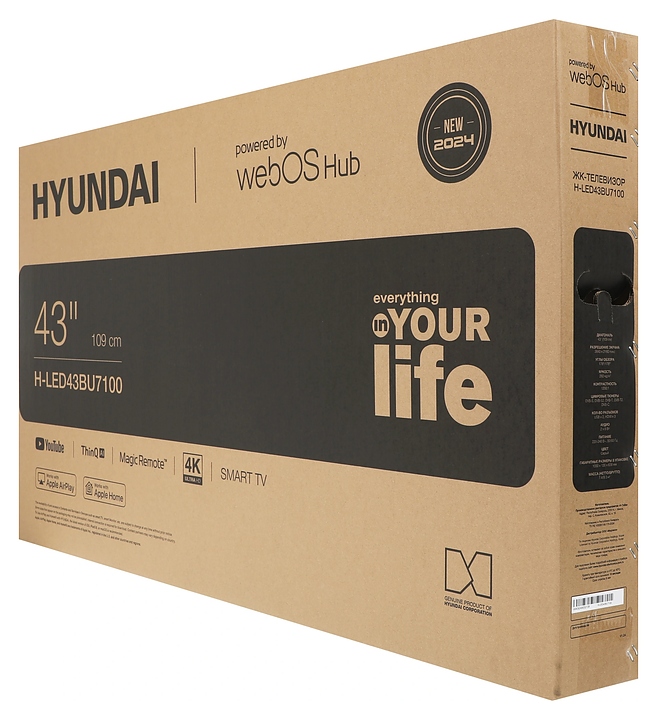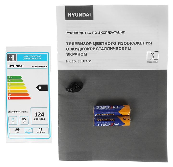 Телевизор Hyundai H-LED43BU7100 предназначен для приема и воспроизведения видео и аудио контента с различных ресурсов таких как телевещание, Интернет, дополнительное подключаемое оборудование и физические носители в домашних условиях, гостиницах, офисах, холлах и кабинетах различных учреждений. Прибор оснащен плоским монитором, акустической стереосистемой с 2 встроенными динамиками, встроенным блоком питания, кабелем питания с вилкой и основным выключателем, пульт – кнопочной клавиатурой, датчиком движения и колесом прокрутки. Кожух прибора выполнен из ударопрочного полимера с матовой поверхностью черного цвета, фронтальная рамка и опоры с поверхностью серого оттенка, корпус пульта обтекаемой формы – из серого пластика.