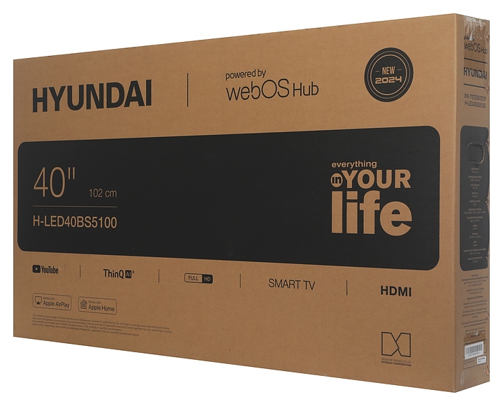 Телевизор Hyundai H-LED40BS5100 предназначен для приема и воспроизведения видео и аудио контента с различных ресурсов таких как телевещание, Интернет, дополнительное подключаемое оборудование и физические носители в домашних условиях, гостиницах, офисах, холлах и кабинетах различных учреждений. Прибор оснащен плоским монитором, акустической стереосистемой с 2 встроенными динамиками, встроенным блоком питания, кабелем питания с вилкой и основным выключателем, пульт – кнопочной клавиатурой. Кожух прибора выполнен из ударопрочного полимера с матовой поверхностью черного цвета, фронтальная рамка и опоры с поверхностью серого оттенка, корпус пульта – из черного пластика.