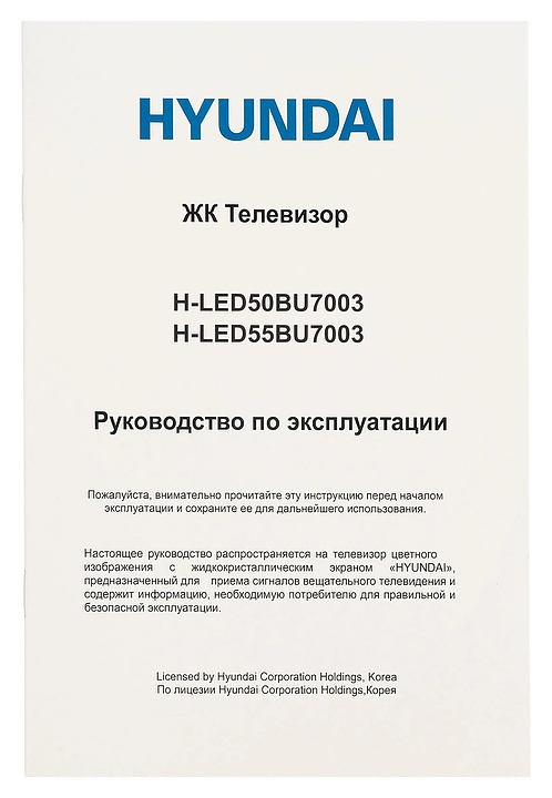 Телевизор Hyundai H-LED55BU7003 предназначен для приема и воспроизведения видео и аудио контента с различных ресурсов таких как телевещание, Интернет, дополнительное подключаемое оборудование и физические носители в домашних условиях, гостиницах, офисах, холлах и кабинетах различных учреждений. Прибор оснащен плоским монитором, акустической стереосистемой с 2 встроенными динамиками, встроенным блоком питания, кабелем питания с вилкой и основным выключателем, пульт – кнопочной клавиатурой. Кожух прибора выполнен из ударопрочного полимера с матовой поверхностью черного цвета, корпус пульта – из черного пластика.