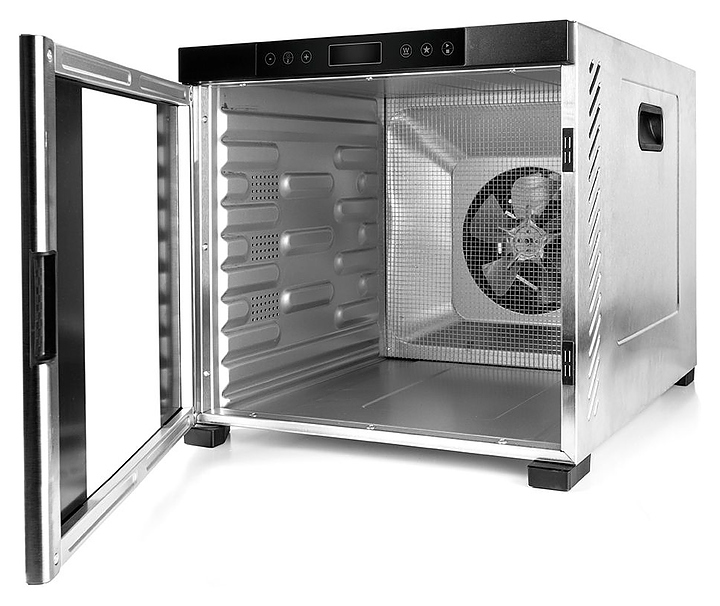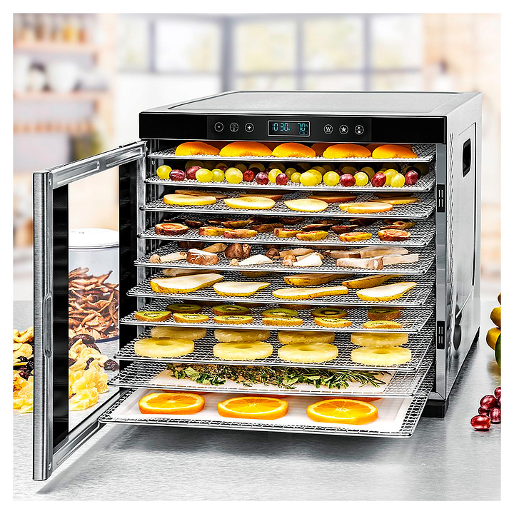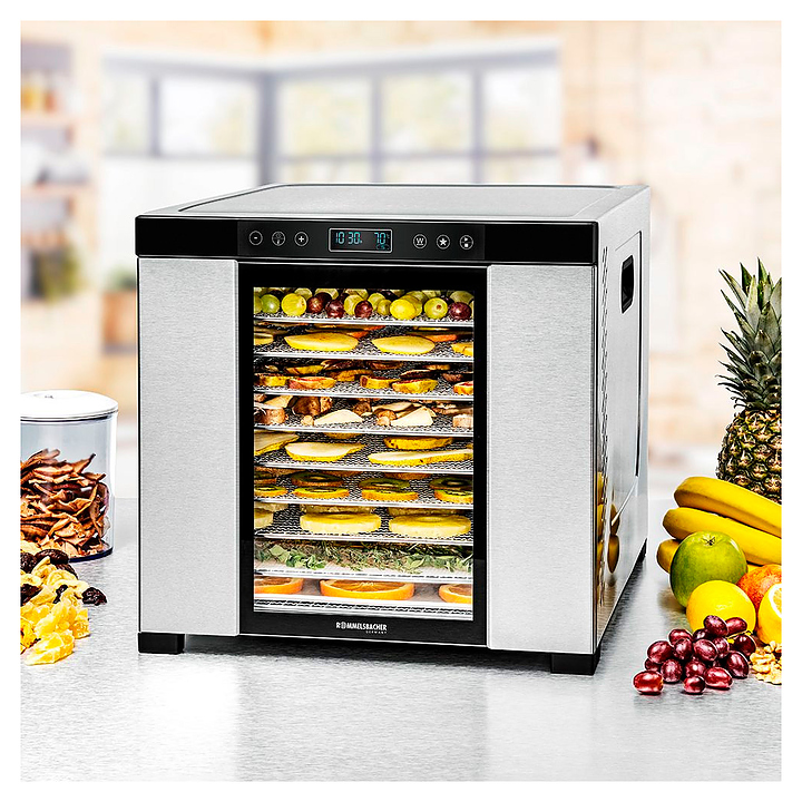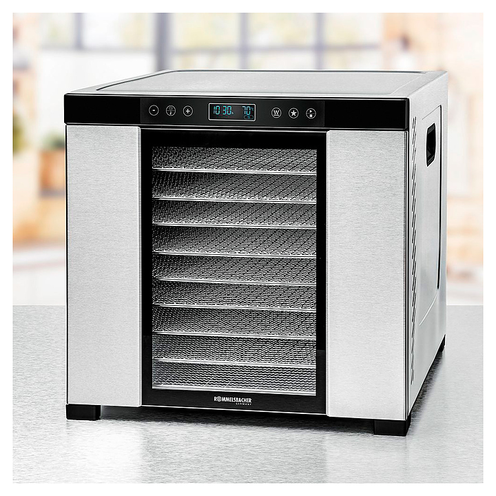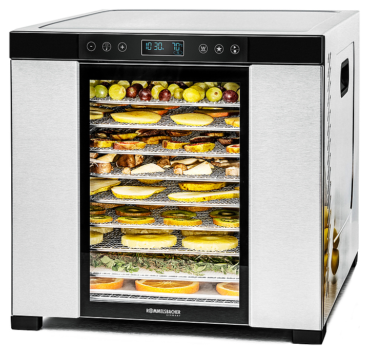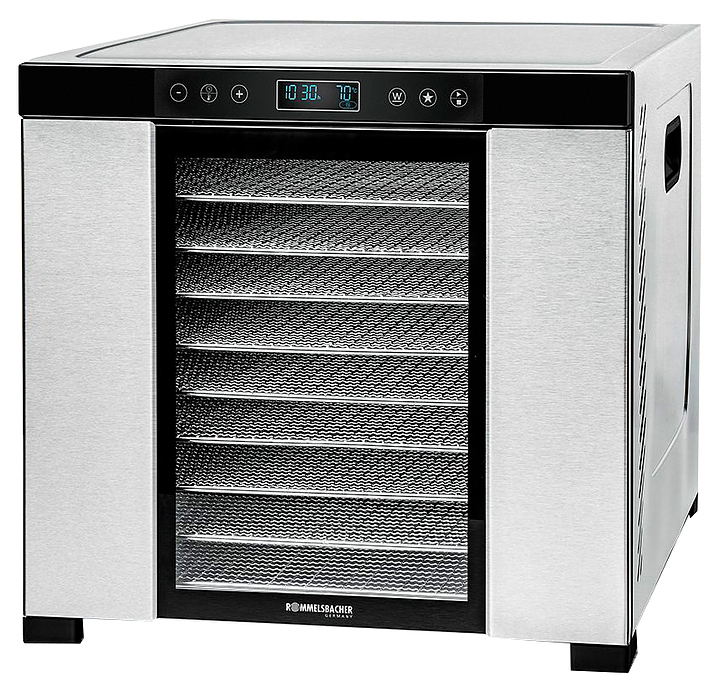 Дегидратор Rommelsbacher DA 1050 предназначен для сушки овощей, фруктов, ягод, грибов и трав в домашних условиях. Модель оснащена сенсорной панелью управления, светодиодный дисплеем, таймером, автоматическим отключением сигнала и боковыми ручками. Корпус и решетки выполнены из нержавеющей стали. В комплект поставки входят 10 решеток для сушки, 2 коврика для сушки и 2 поддона для сушки. Особенности: