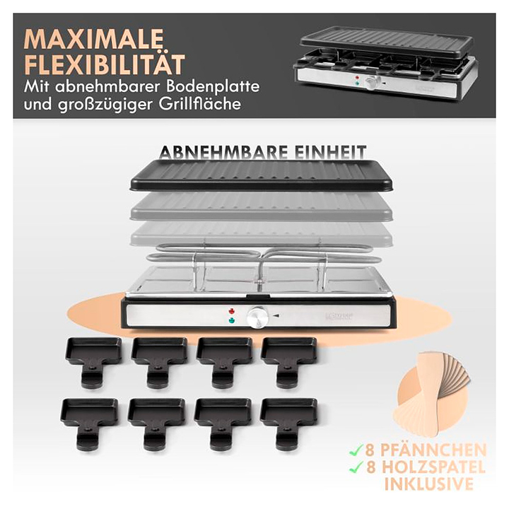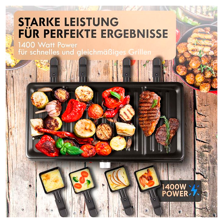 Гриль-раклетница Bomann RG 6039 CB предназначен для жарки мяса, рыбы и овощей в частных домах, квартирах, отелях и офисах. Модель оснащена прорезиненными ножками, ненагревающимся корпусом и температурным индикатором готовности. Антипригарное покрытие гарантирует легкое приготовление и простой уход. Плавно регулируемый термостат позволяет контролировать температуру. Пластина выполнена из литого чугуна, термостат - из нержавеющей стали. В комплект поставки входят 8 сковородок с антипригарным покрытием и 8 деревянных лопаточек. Особенности: