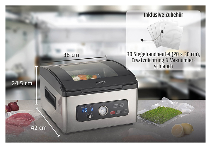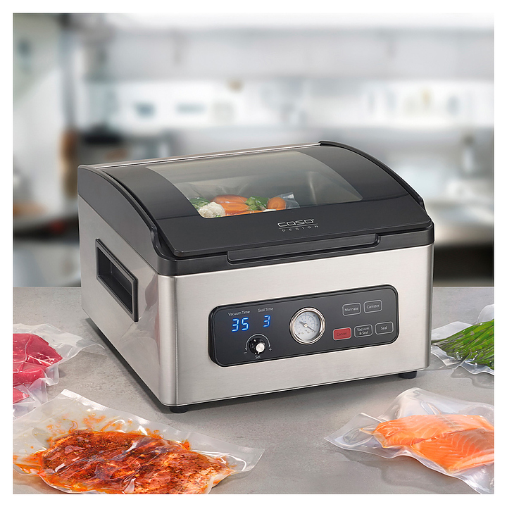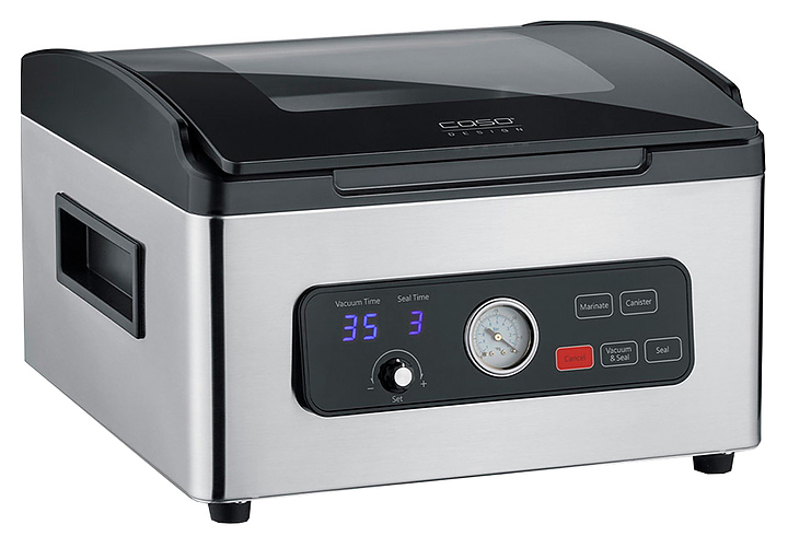 Вакуумный упаковщик CASO VacuChef 700 используется на предприятиях общественного питания и торговли для упаковки в вакуум мяса, рыбы, овощей и фруктов для увеличения срока хранения. Модель оснащена крышкой с плавным закрытием, манометром для измерения давления и цифровым дисплеем процесса вакуумирования и запайки. Сила вакуума и время запаивания регулируются поворотным регулятором. Корпус выполнен из нержавеющей стали, крышка - из прочного закаленного стекла. В комплект поставки входят запасная запаечная планка, 30 пакетов 20х30 см, уплотнитель и вакуумный шланг с переходником. Особенности: