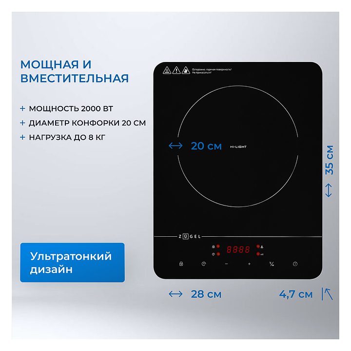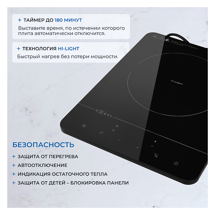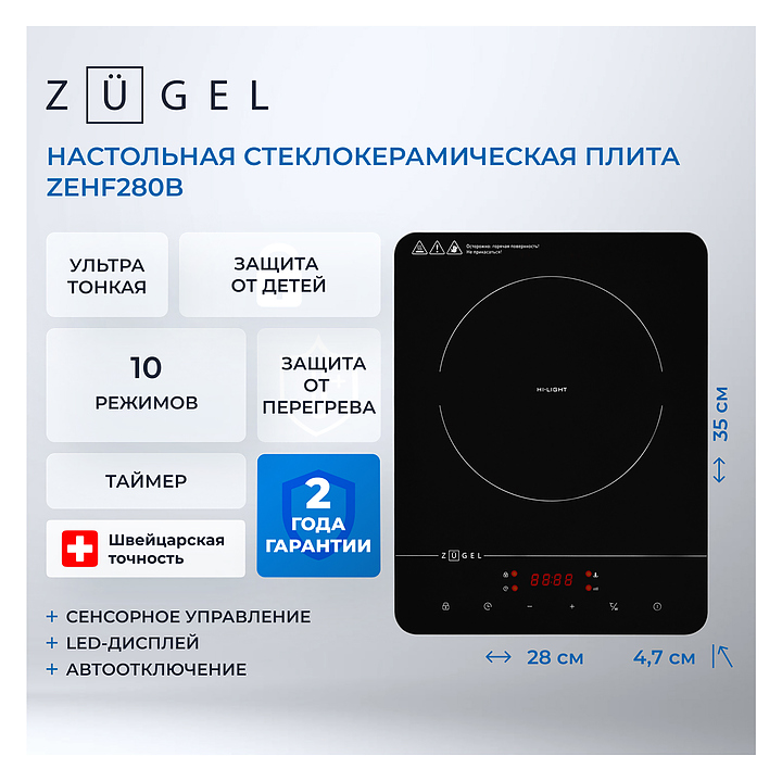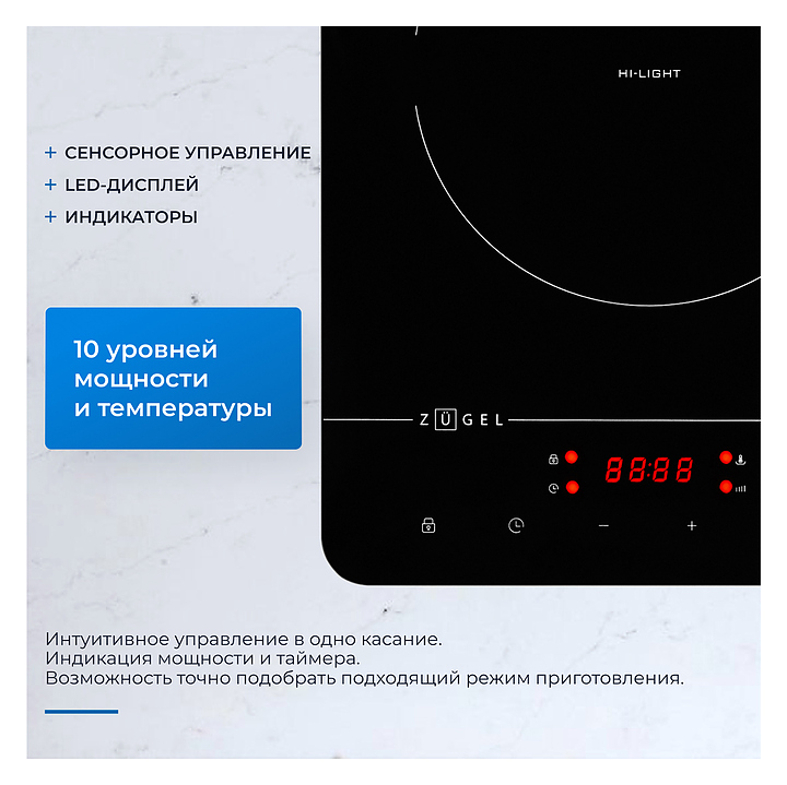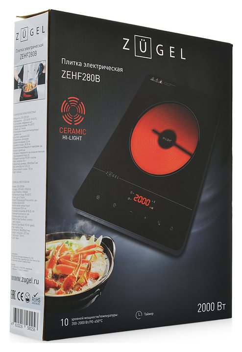 Электрическая плита Zugel ZEHF280B предназначена для приготовления блюд в наплитной посуде в домашних условиях. Модель оснащена 1 конфоркой, сенсорным управлением, LED-дисплеем, таймером, LED-индикацией мощности и температуры. Технология Hi-Light обеспечивает быстрый нагрев без потери мощности. Рабочая поверхность выполнена из стеклокерамики, корпус - из PC/GF-пластика. Особенности: