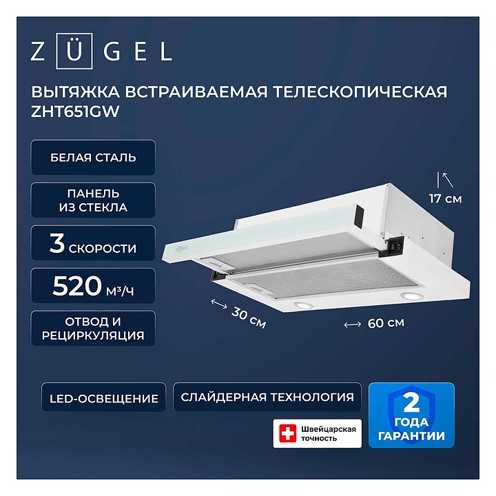 Кухонная вытяжка Zugel ZHT651GW используется в домашних условиях для очистки воздуха от продуктов горения, копоти и запахов в процессе приготовления пищи путем принудительной вентиляции. Модель оснащена электронным кнопочным управлением и 3 скоростями. Слайдерная технология гарантирует компактность и позволяет увеличить площадь эффективной работы. Светодиодные лампы гарантируют яркое и равномерное освещение рабочей зоны. Корпус выполнен из крашеной стали, панель - из закаленного стекла, жировой фильтр - из алюминия. В комплект поставки входят 2 жироулавливающих фильтра. Особенности: