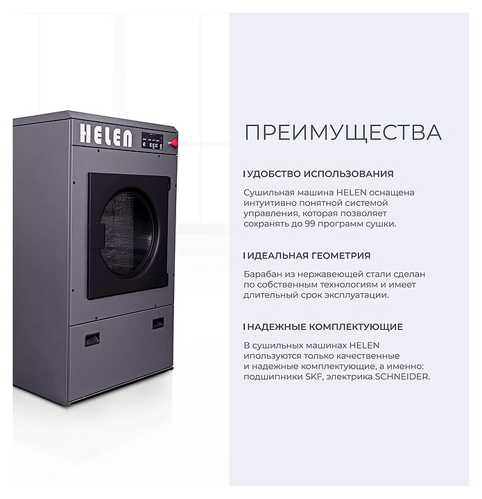 Сушильная машина HELEN HD30PRO используется в прачечных, гостиницах, салонах красоты, больницах и детских учреждениях для сушки различного белья и одежды с относительной влажностью до 50%. Модель оснащена датчиком остаточной влажности, встроенным вентилятором и фильтром очистки воздуха большой площади с системой диагностики засорения. Барабан выполнен из нержавеющей стали. Особенности: