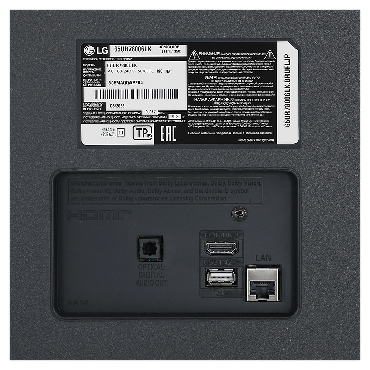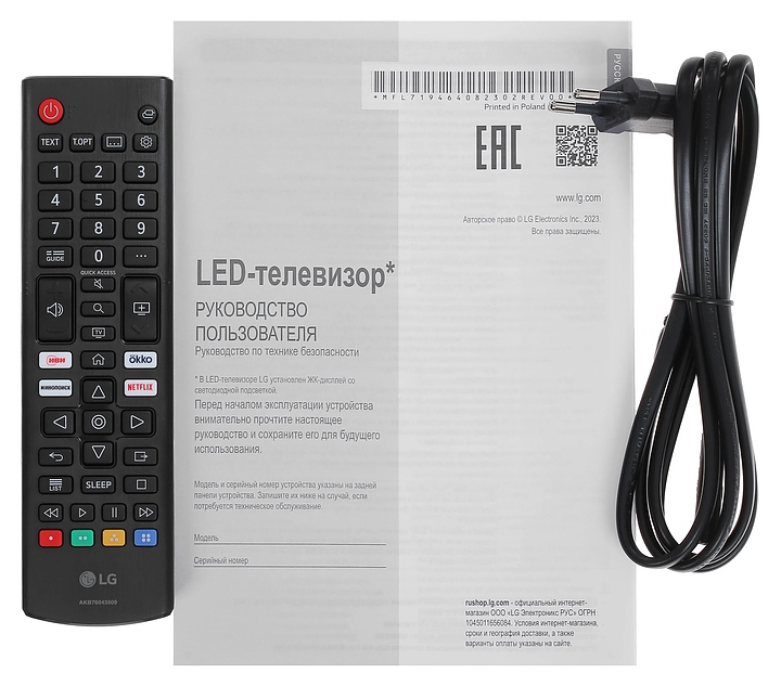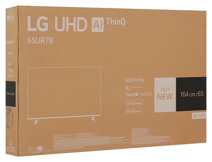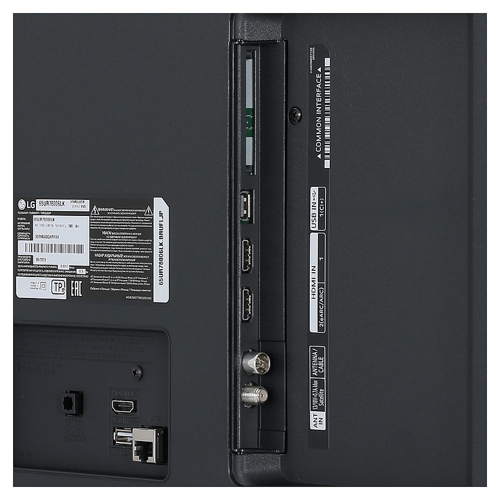 Телевизор LG 65UR78006LK.ARUB предназначен для приема и воспроизведения видео и аудио контента с различных ресурсов таких как телевещание, Интернет, дополнительное подключаемое оборудование и физические носители в домашних условиях, гостиницах, офисах, холлах и кабинетах различных учреждений. Прибор оснащен плоским монитором, акустической стереосистемой с 2 встроенными направленными вниз динамиками, встроенным блоком питания, кабелем питания с вилкой и основным выключателем, пульт – кнопочной клавиатурой. Кожух прибора выполнен из ударопрочного полимера с матовой поверхностью черного цвета, фронтальная рамка с поверхностью оттенка серый металлик, опоры с поверхностью черного цвета, корпус пульта – из черного пластика.