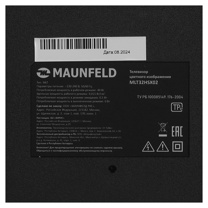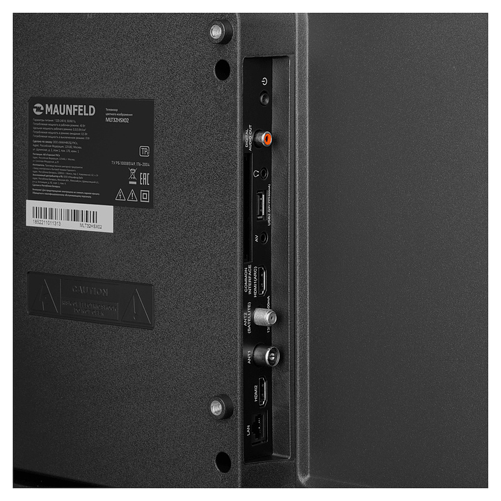Телевизор Maunfeld MLT32HSX02 предназначен для приема и воспроизведения видео и аудио контента с различных ресурсов таких как телевещание, Интернет, дополнительное подключаемое оборудование и физические носители в домашних условиях, гостиницах, офисах, холлах и кабинетах различных учреждений. Прибор оснащен плоским широкоформатным монитором, акустической стереосистемой с 2 встроенными динамиками, встроенным блоком питания и основным выключателем, пульт – кнопочной клавиатурой. Кожух прибора выполнен из ударопрочного полимера с матовой поверхностью черного цвета, рамка экрана и опоры с поверхностью черного цвета, корпус пульта – из черного пластика.
