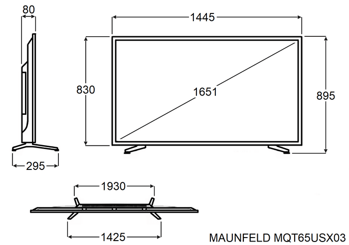 Телевизор Maunfeld MQT65USX03 предназначен для приема и воспроизведения видео и аудио контента с различных ресурсов таких как телевещание, Интернет, дополнительное подключаемое оборудование и физические носители в домашних условиях, гостиницах, офисах, холлах и кабинетах различных учреждений. Прибор оснащен плоским широкоформатным монитором, акустической стереосистемой с 2 встроенными динамиками, встроенным блоком питания и основным выключателем, пульт – кнопочной клавиатурой. Кожух прибора выполнен из ударопрочного полимера с матовой поверхностью черного цвета, рамка экрана и опоры с поверхностью серого оттенка, корпус пульта – из черного пластика.