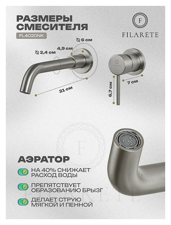 Смеситель для раковины встраиваемый FILARETE Roun FL4020NK предназначен для использования в ванных помещениях для подачи горячей и холодной воды. Серия выполнена в современном стиле. Модель оснащена керамическим картриджем, обеспечивающим плавный ход рычага смесителя, контроль и точность при выборе напора и температуры воды, а также аэратором для создания мягкой ровной струи без разбрызгивания. Изделие выполнено из высококачественной латуни, отличающейся прочностью, долговечностью и устойчивостью к перепадам температур. Комплект поставки: