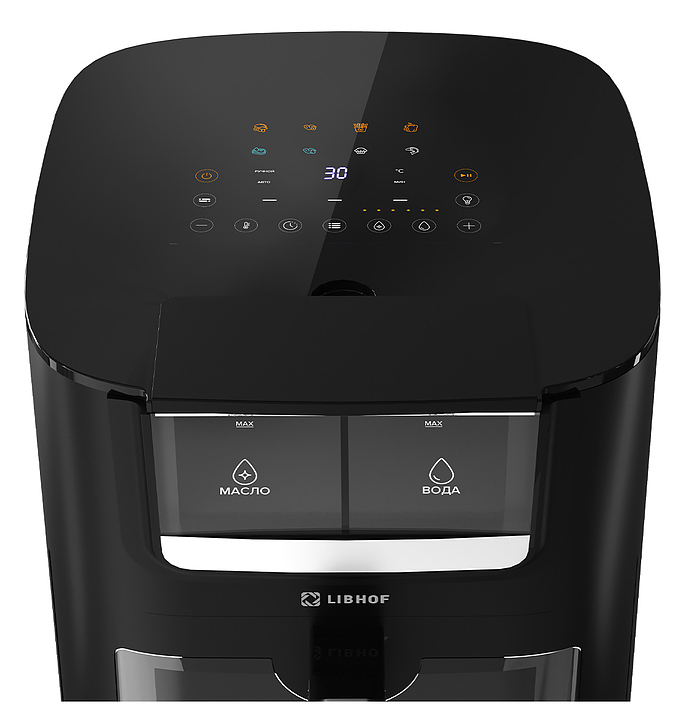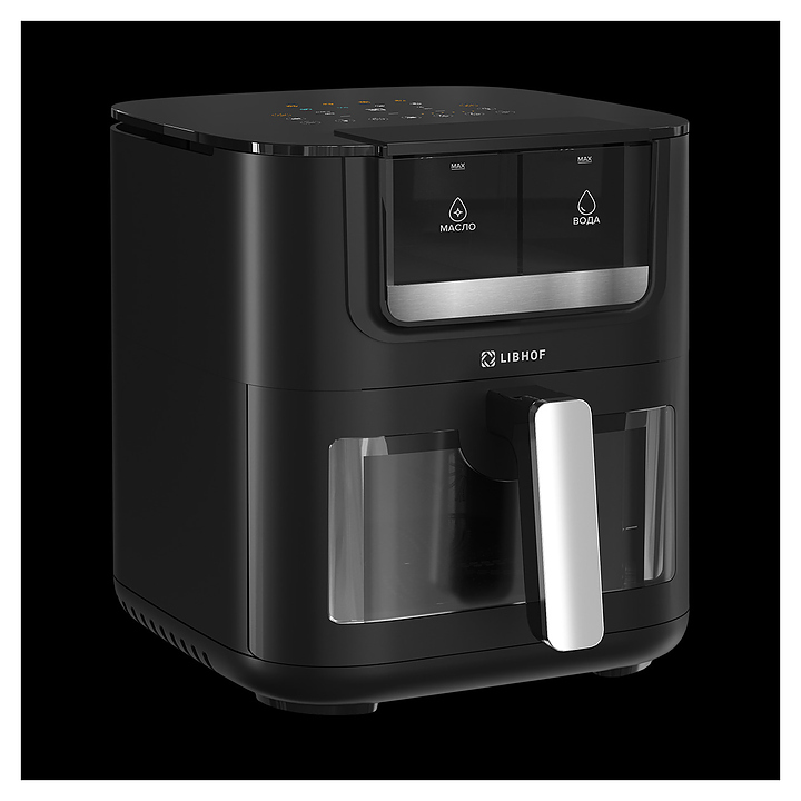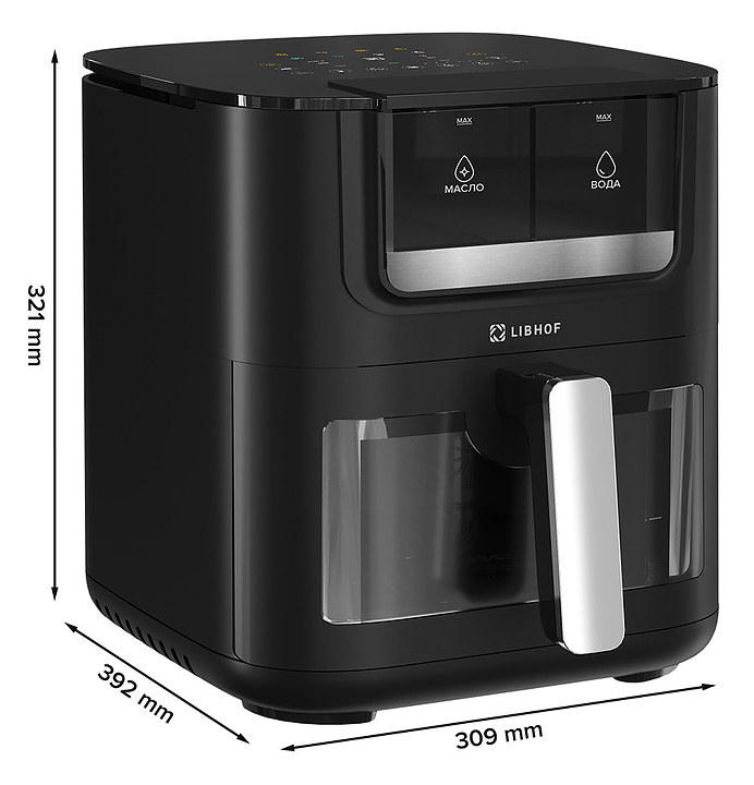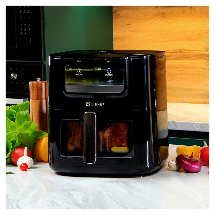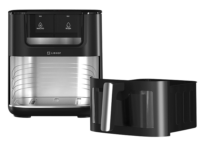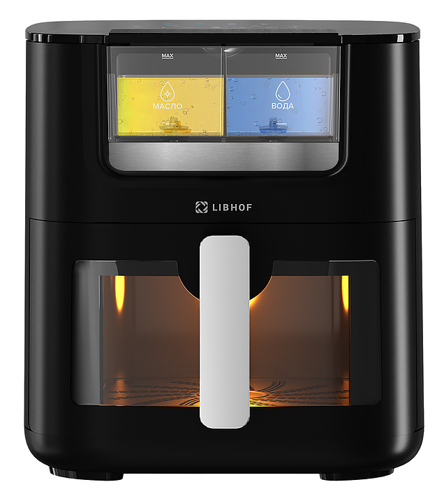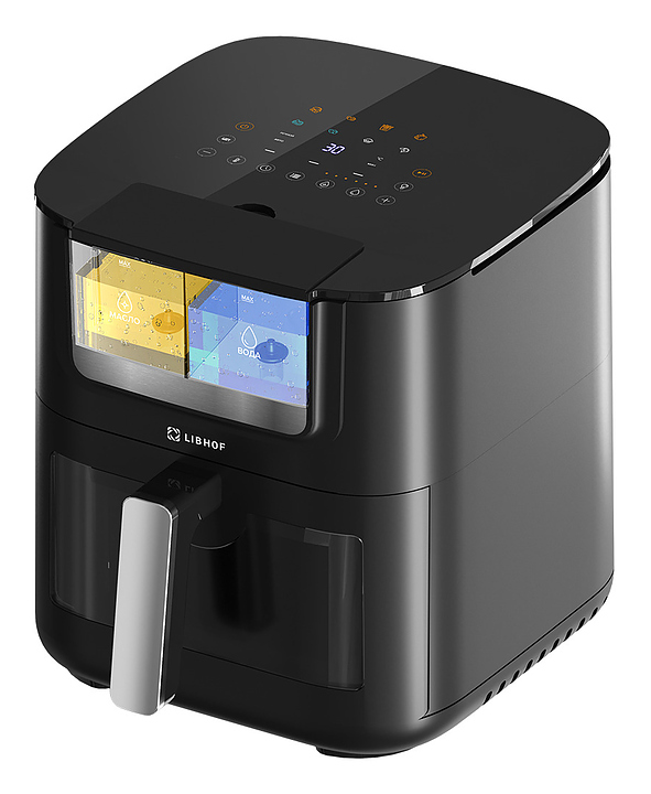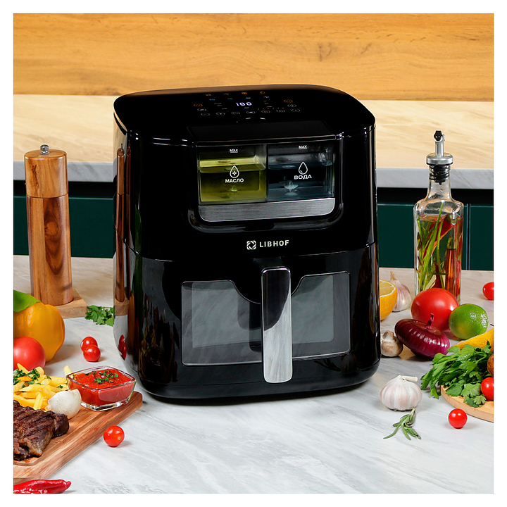 Электрический аэрогриль Libhof AFR-07 используется в домашних условиях для приготовления различных блюд с хрустящей корочкой без использования масла либо с добавлением небольшого его количества благодаря принудительной циркуляции горячего воздуха в камере. Модель оснащена трубчатым нагревательным элементом в верхней части, выдвижной чашей с ручкой, кабелем питания с вилкой, электронной панелью управления с сенсорными функциональными клавишами и цифровым дисплеем индикации. Корпус выполнен из ударопрочного пластика черного цвета, антипригарное тефлоновое покрытие чаши. В комплект поставки входят аэрогриль, противень, инструкция. Особенности: