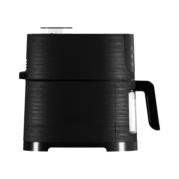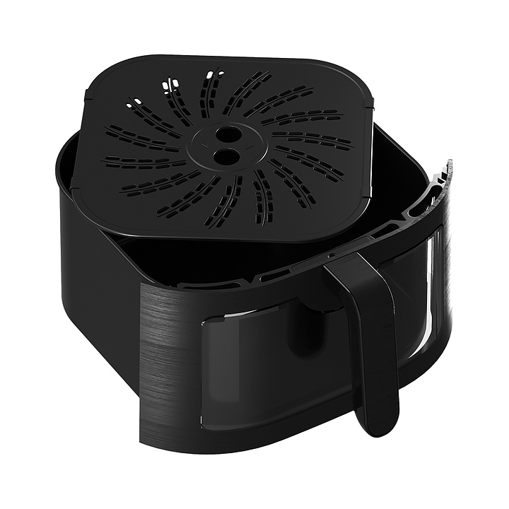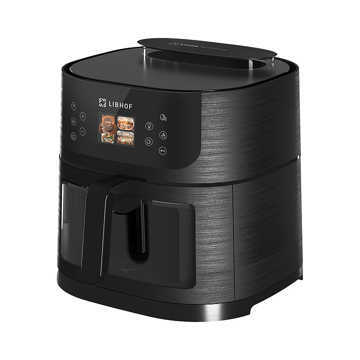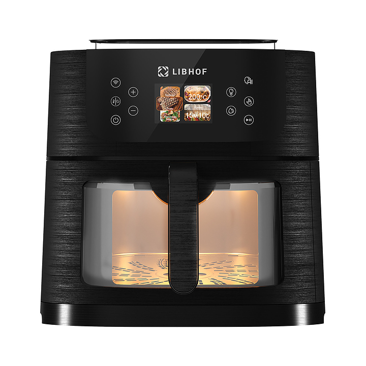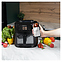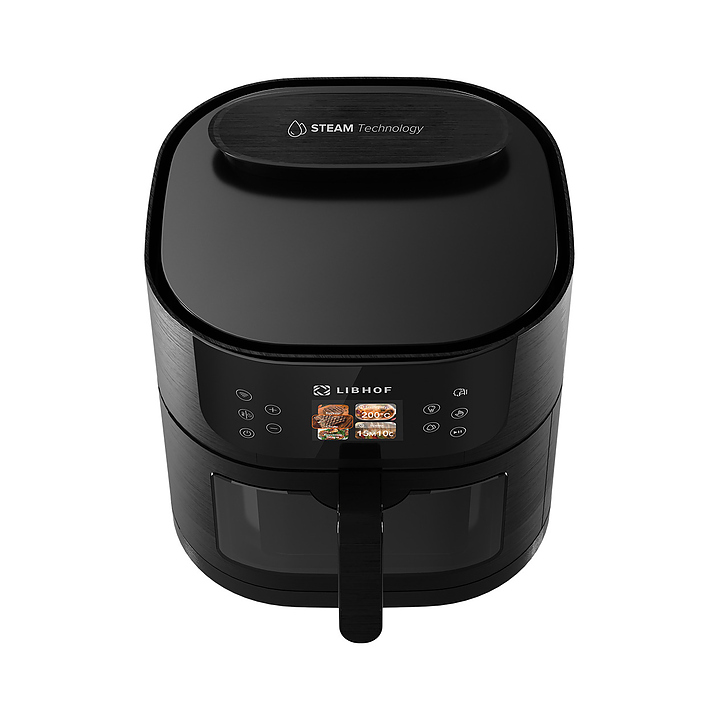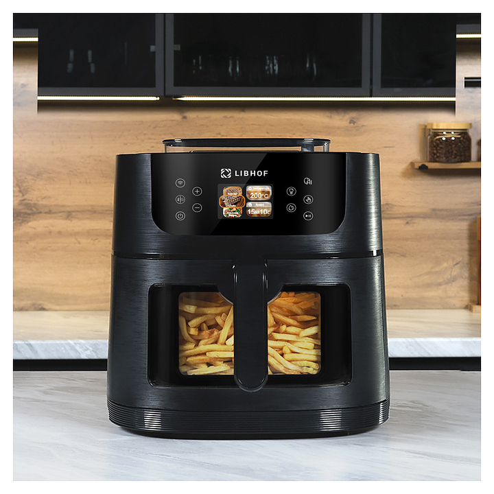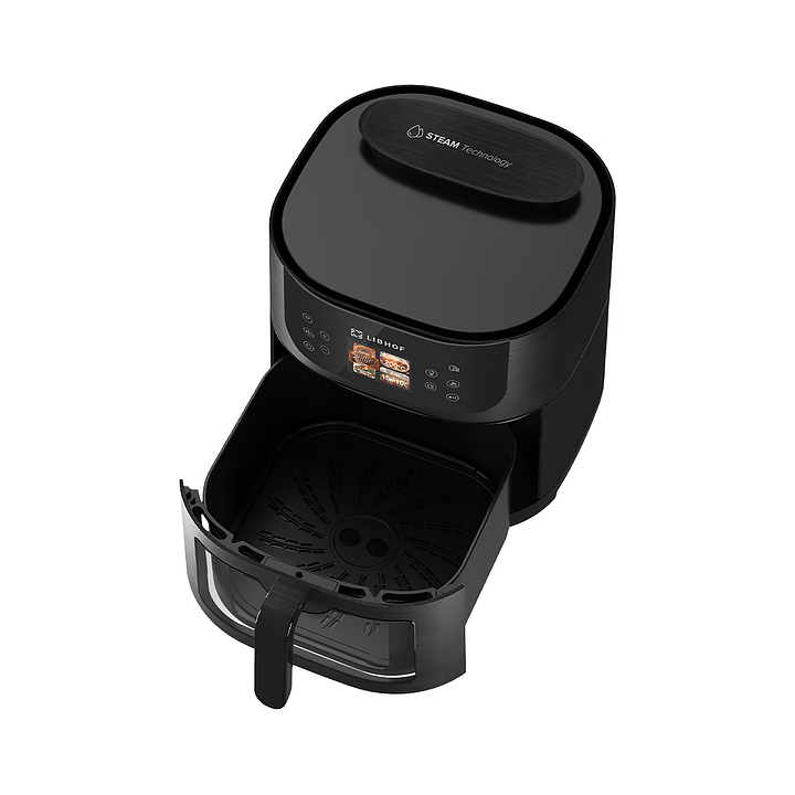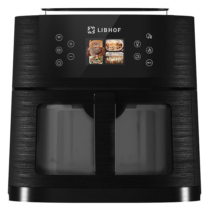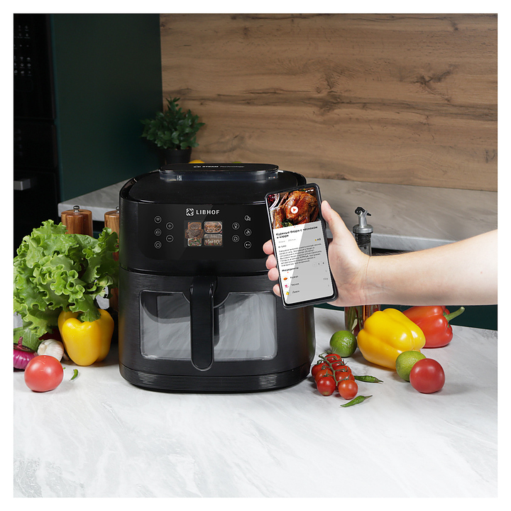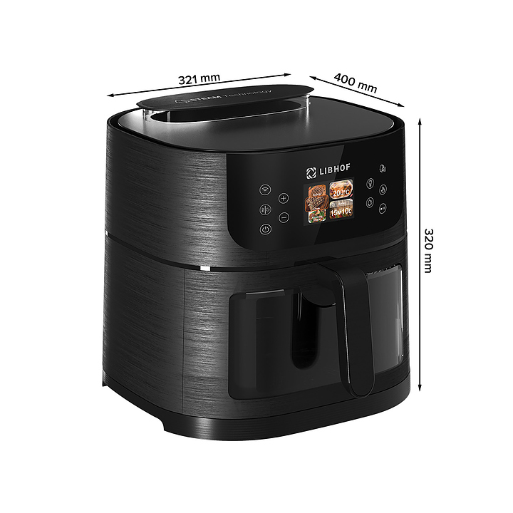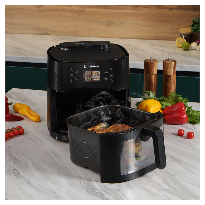 Электрический аэрогриль Libhof AFR-08 используется в домашних условиях для приготовления различных блюд с хрустящей корочкой без использования масла либо с добавлением небольшого его количества благодаря принудительной циркуляции горячего воздуха в камере. Модель оснащена трубчатым нагревательным элементом в верхней части, выдвижной чашей с ручкой, кабелем питания с вилкой, электронной панелью управления с сенсорными функциональными клавишами и цифровым дисплеем индикации. Корпус выполнен из ударопрочного пластика черного цвета, антипригарное тефлоновое покрытие чаши. В комплект поставки входят аэрогриль, противень, инструкция. Особенности: