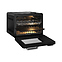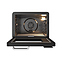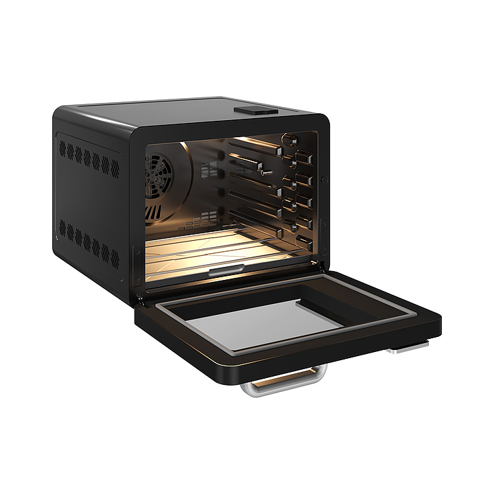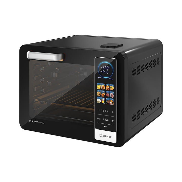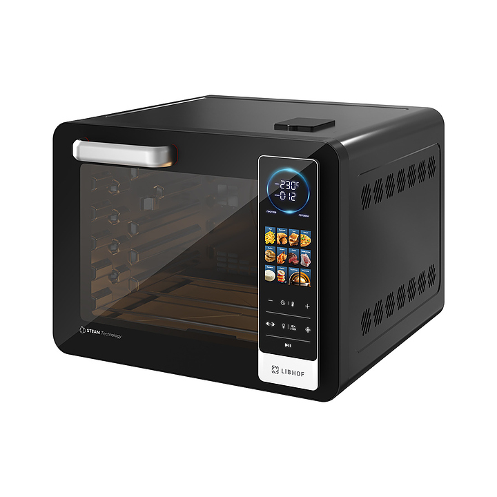 Электрический аэрогриль Libhof AFG-45s используется в домашних условиях для приготовления различных блюд с хрустящей корочкой без использования масла либо с добавлением небольшого его количества благодаря принудительной циркуляции горячего воздуха в камере. Модель оснащена трубчатым нагревательным элементом в верхней части, распашной дверцей, кабелем питания с вилкой, электронной панелью управления с сенсорными функциональными клавишами и цифровым дисплеем индикации. Корпус выполнен из ударопрочного пластика черного цвета, антипригарное тефлоновое покрытие. В комплект поставки входят аэрогриль, эмалированный противень, хромированная решетка, корзина для фритюра SUS 430, хромированная ручка для противня, поддон для крошек, набор для вертела, ложка, камень для пиццы, инструкция, книга рецептов. Особенности: