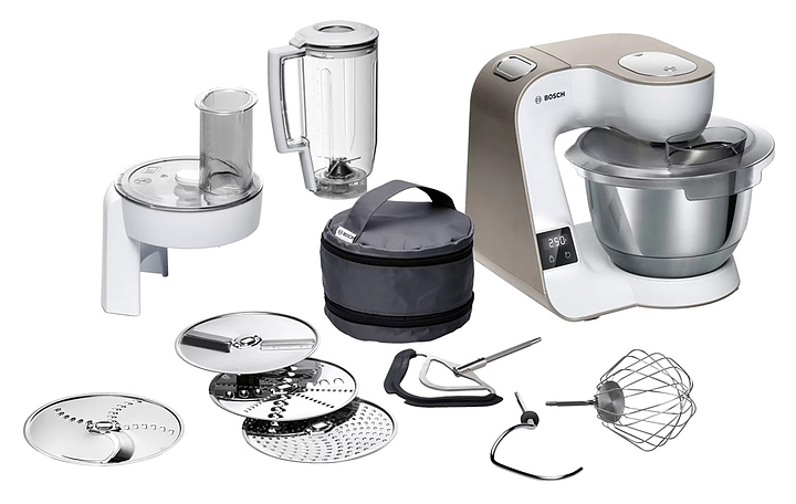 Кухонный комбайн Bosch MUM5XW20 серии MUM5 предназначен для замеса теста, смешивания и взбивания различных продуктов в квартирах и частных домах. Модель оснащена поворотным переключателем, кнопками управления и индикатором работы. При нажатии кнопки «Импульсный режим» комбайн начинает работу, при отпускании - мгновенно прекращает, что позволяет строго контролировать процесс измельчения или перемешивания. Технология EasyArmLift осуществляет быструю и легкую смену насадок нажатием кнопки. Корпус выполнен из пластика, чаша - из нержавеющей стали, ножки - из резины, блендер - из тритана. В комплект поставки входят блендер, венчик для взбивания, венчик для жидкого теста, крюк для теста и сумка для насадок. Особенности: