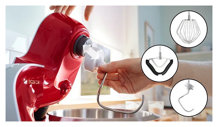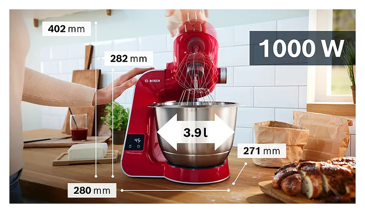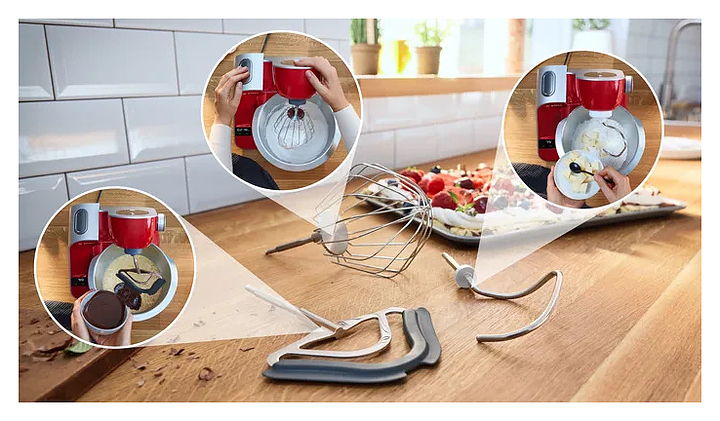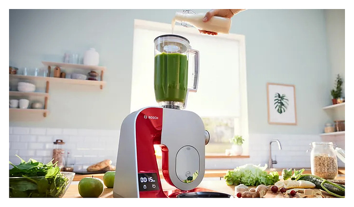Кухонный комбайн Bosch MUM5X720 серии MUM5 предназначен для замеса теста, измельчения, смешивания и взбивания различных продуктов в квартирах и частных домах. Модель оснащена поворотным переключателем, кнопками управления и индикатором работы. При нажатии кнопки «Импульсный режим» комбайн начинает работу, при отпускании - мгновенно прекращает, что позволяет строго контролировать процесс измельчения или перемешивания. Технология EasyArmLift осуществляет быструю и легкую смену насадок нажатием кнопки. Корпус выполнен из пластика, ножи и чаша - из нержавеющей стали, ножки - из резины. Комплектация: