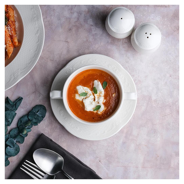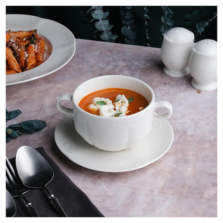 Бульонная пара Noble Aristocrat 313605-313009 предназначена для профессионального использования в кафе и ресторанах, а также в домашних условиях. Чашка для бульона оснащена двумя ручками. Изделие выполнено из фарфора, технология изготовления и химический состав которого, обеспечивают устойчивую к истиранию и царапинам, полностью герметичную гигиеничную поверхность. Особенности: