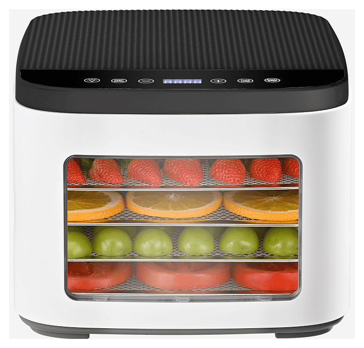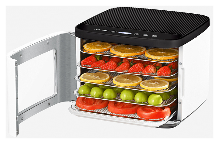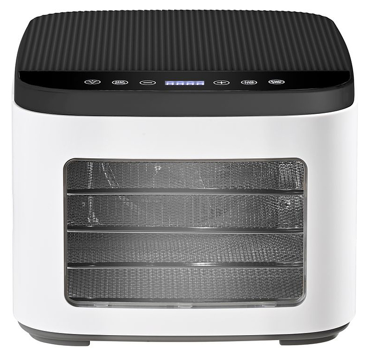 Сушилка для овощей и фруктов Geniard GA-309C предназначена для дегидрации фруктов, овощей, трав, мяса, приготовления пастилы и йогуртов в квартирах, частных домах, кафе и ресторанах. Модель оснащена электронной панелью управления, цифровым дисплеем, таймером, фильтром для защиты от пыли и сора, регулировкой и поддержанием температуры, а также подсветкой камеры для визуального контроля. Равномерный горизонтальный обдув и сушка позволяют достичь оптимального результата. В комплект поставки входят 5 сетчатых решеток и 1 поддон для фруктовых пастилок. Дополнительные характеристики: