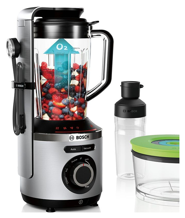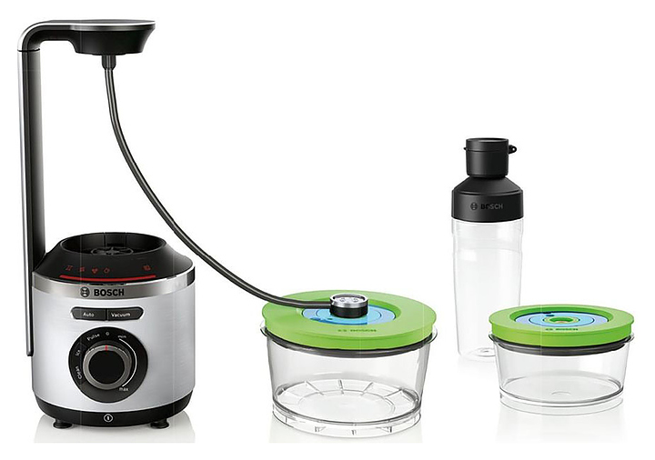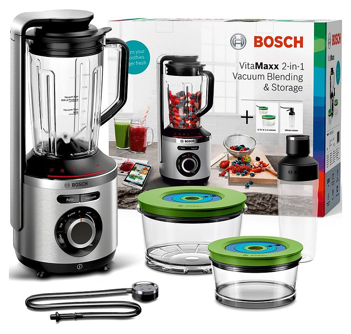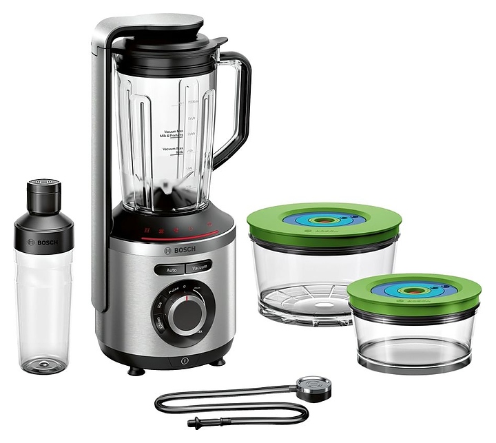 Вакуумный блендер Bosch MMBV625M серии VitaMaxx предназначен для измельчения фруктов, овощей, орехов и трав, а также приготовления соусов, смузи и супов-пюре в домашних условиях. Модель оснащена ножом с 6 лезвиями специальной формы, кнопками и поворотным переключателем. Насос для вакуумирования и специальные контейнеры продлевают свежесть продуктов и срок хранения в 2 раза дольше, чем в обычных емкостях. Турбо-режим обеспечивает максимальную мощность за короткое время для быстрого измельчения твердых продуктов и приготовления однородных смесей, коктейлей и пюре. Корпус выполнен из алюминия, кувшин - из тритана. В комплект поставки входят бутылочка 2Go, вакуумный насос и 3 вакуумных контейнера. Особенности: